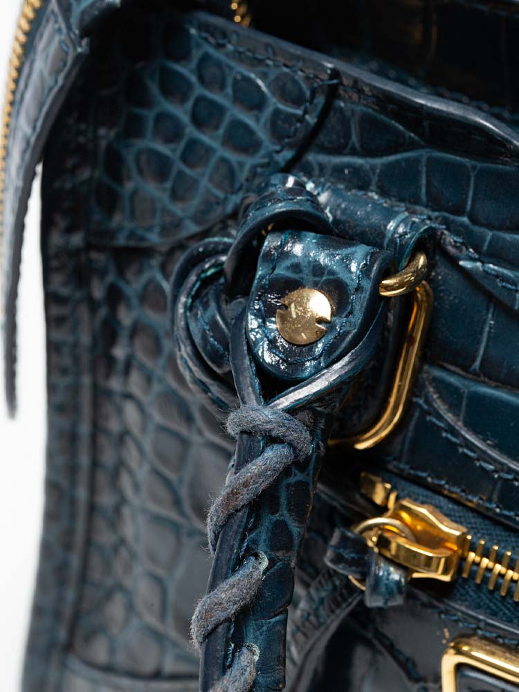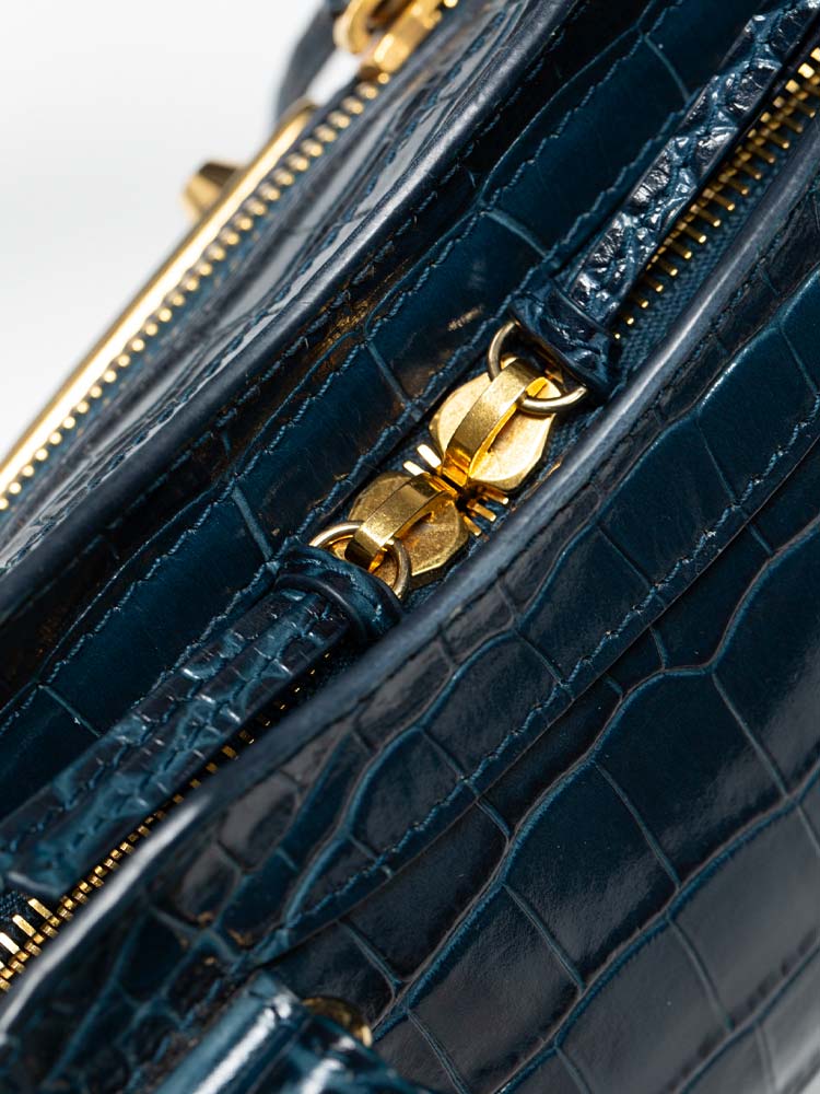 This bag is crafted of calfskin crocodile embossed material. It features top handles with a hand-stitched detail, a signature facing zipper pocket, leather belts, and polished gold hardware.