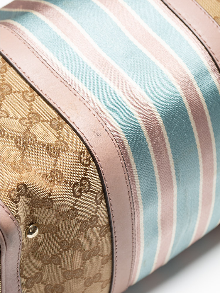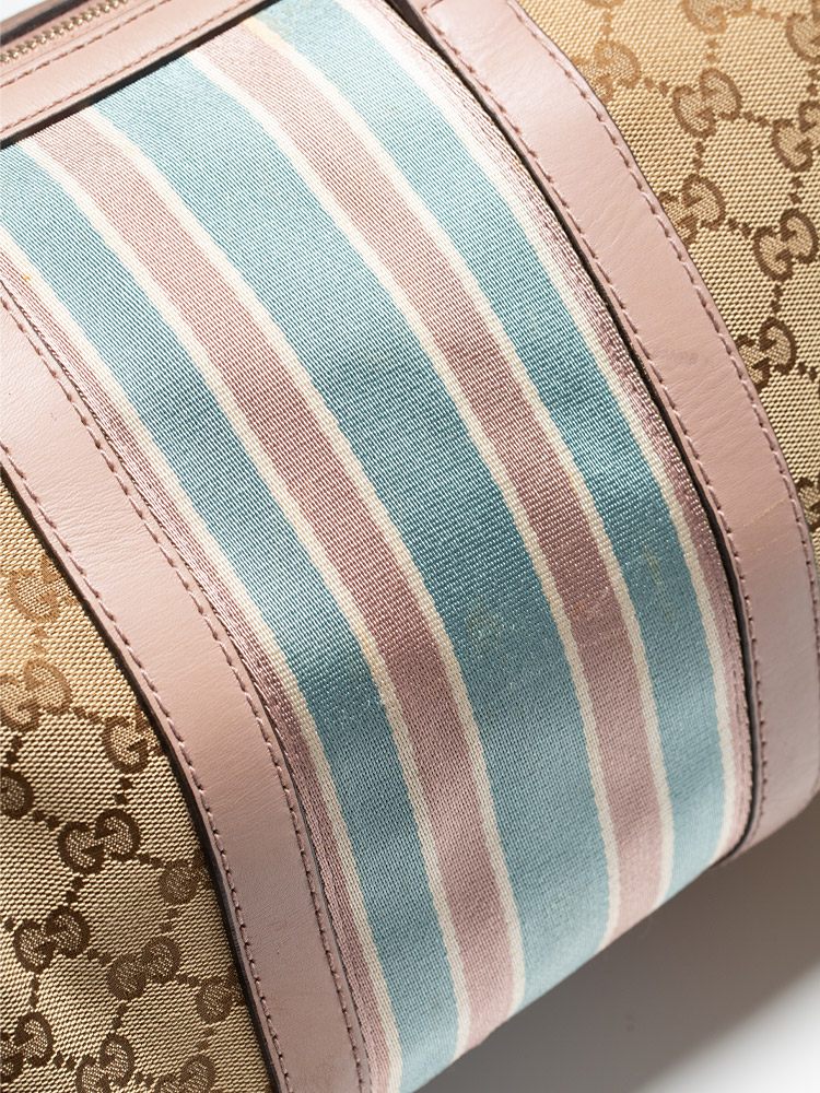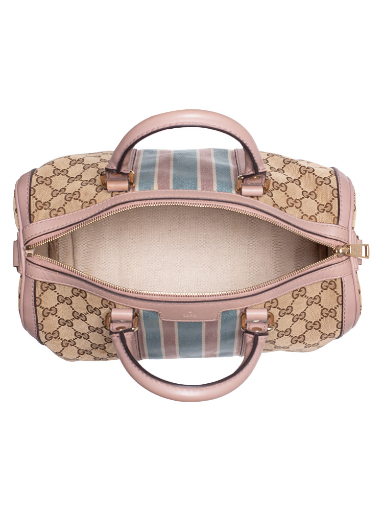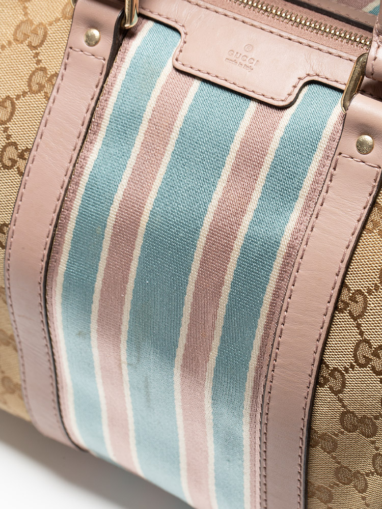 This boston bag is crafted of Gucci GG monogram canvas. The bag features pink rolled leather top handles, pink leather trim, and a web striping in pink and blue. The top zipper opens to a fabric interior with zipper and patch pockets.