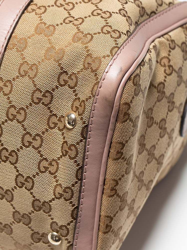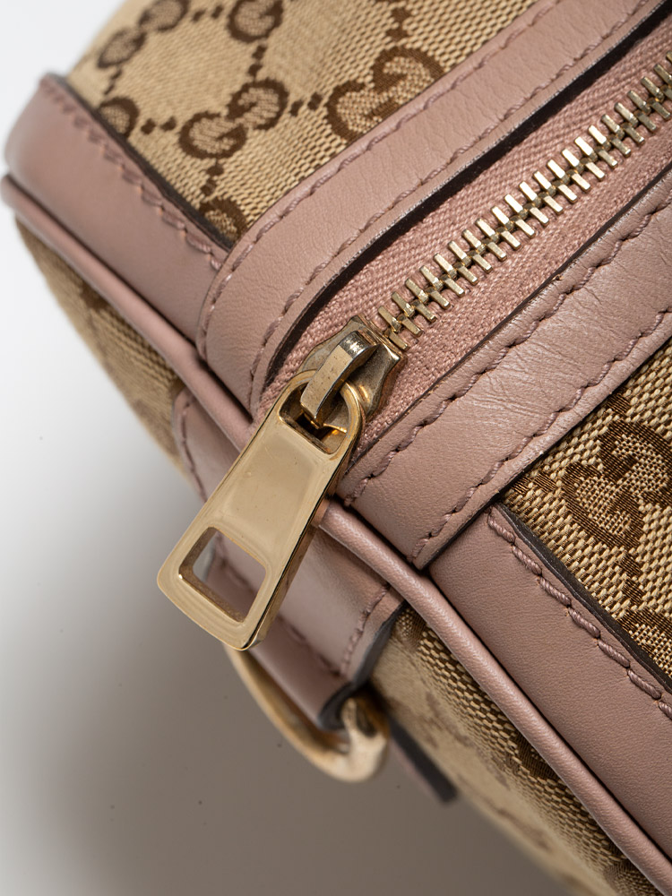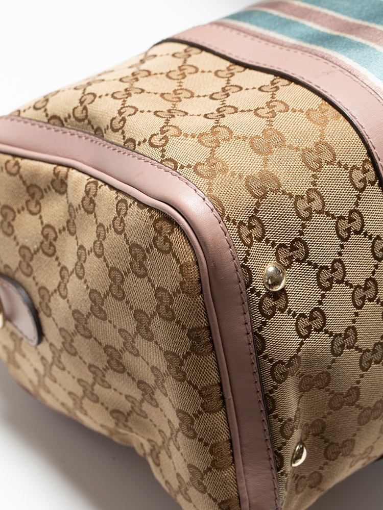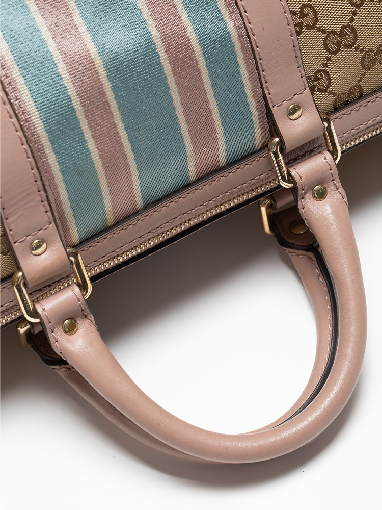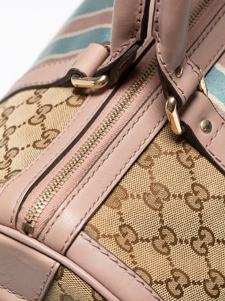 This boston bag is crafted of Gucci GG monogram canvas. The bag features pink rolled leather top handles, pink leather trim, and a web striping in pink and blue. The top zipper opens to a fabric interior with zipper and patch pockets.