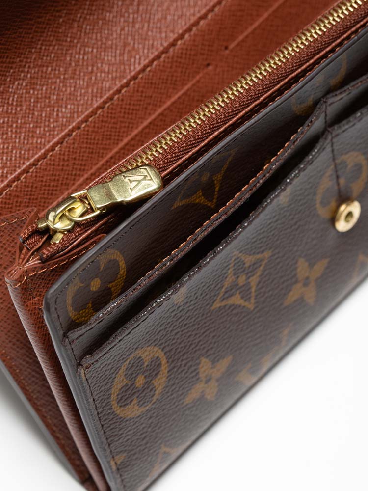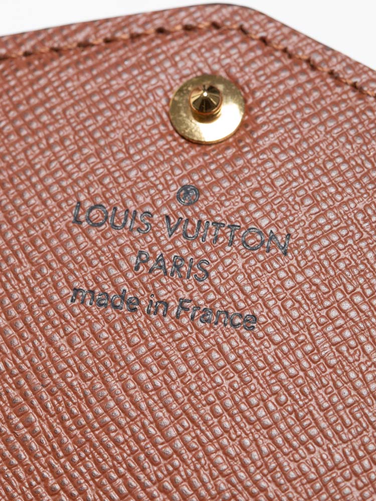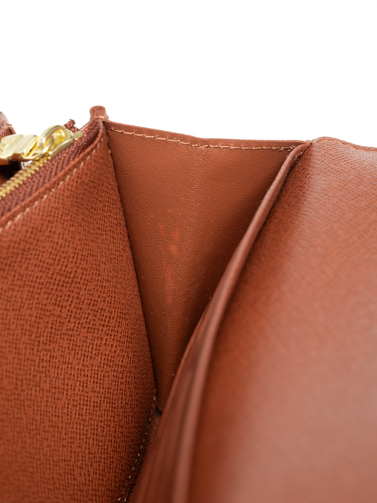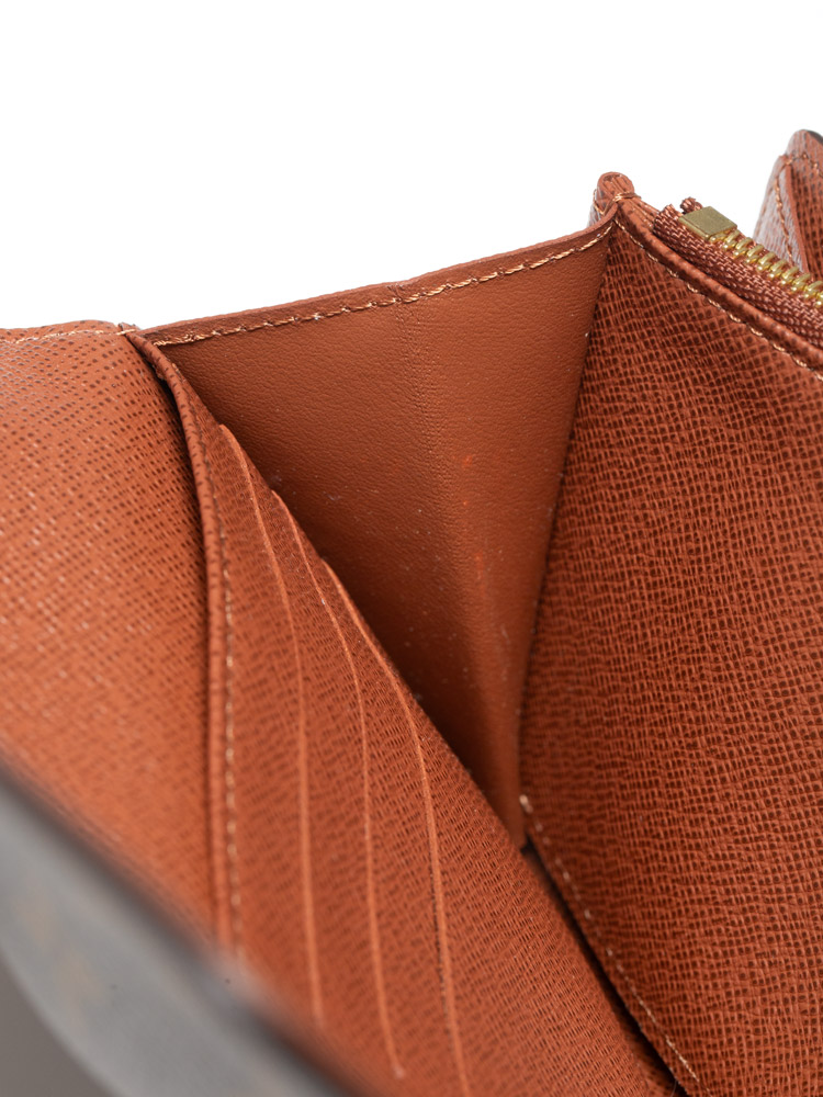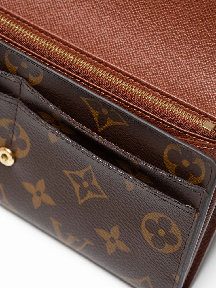 Crafted of traditional Louis Vuitton monogram toile canvas. The envelope-style crossover flap opens with a polished brass snap to a partitioned terra cotta cross-grain leather interior.