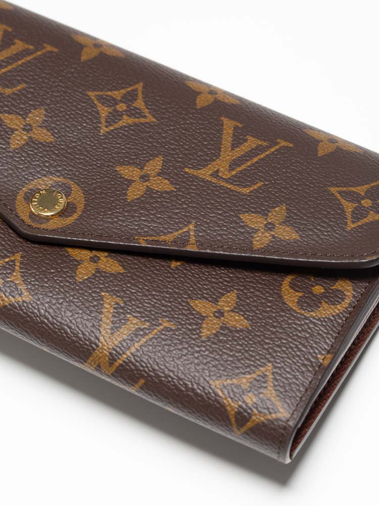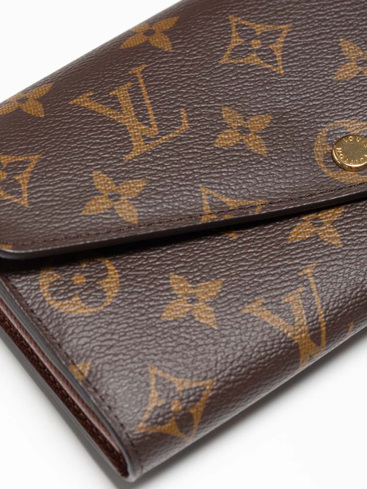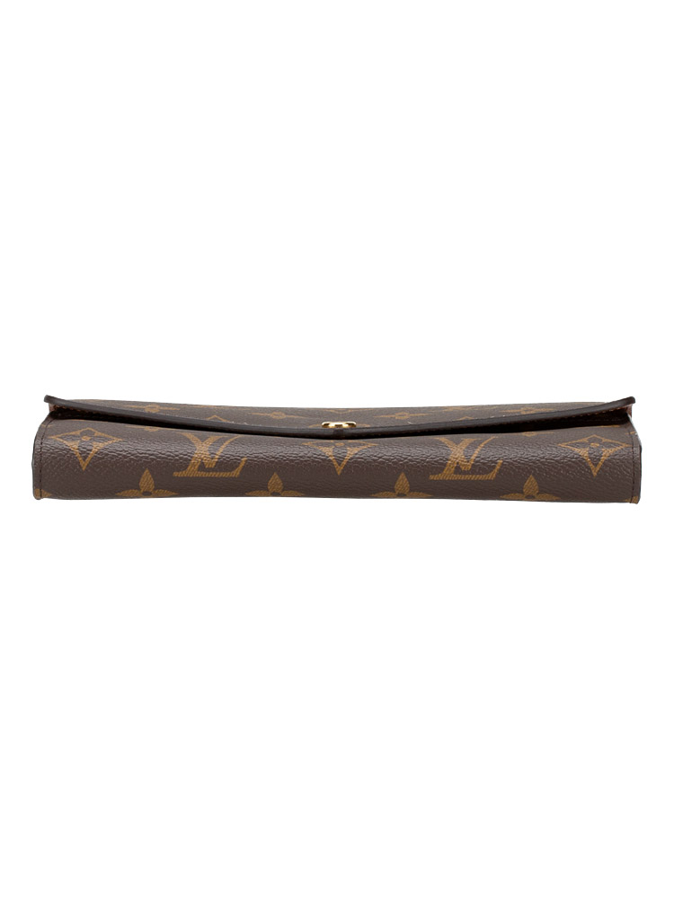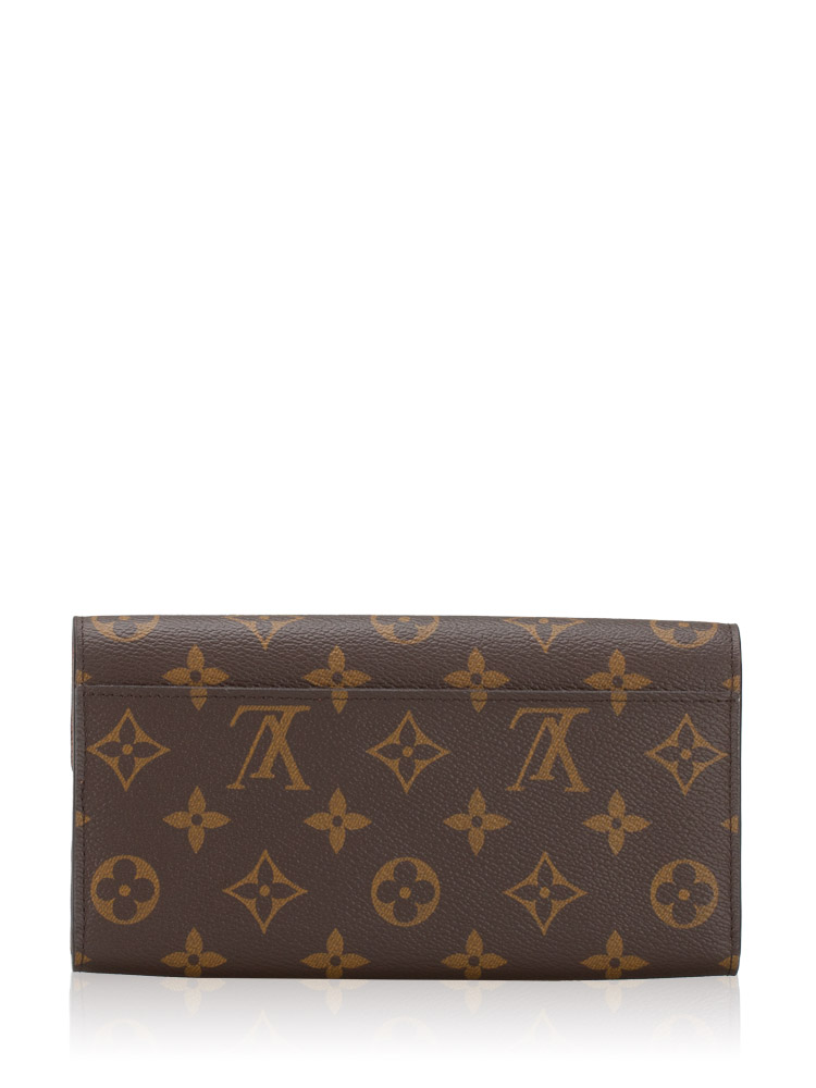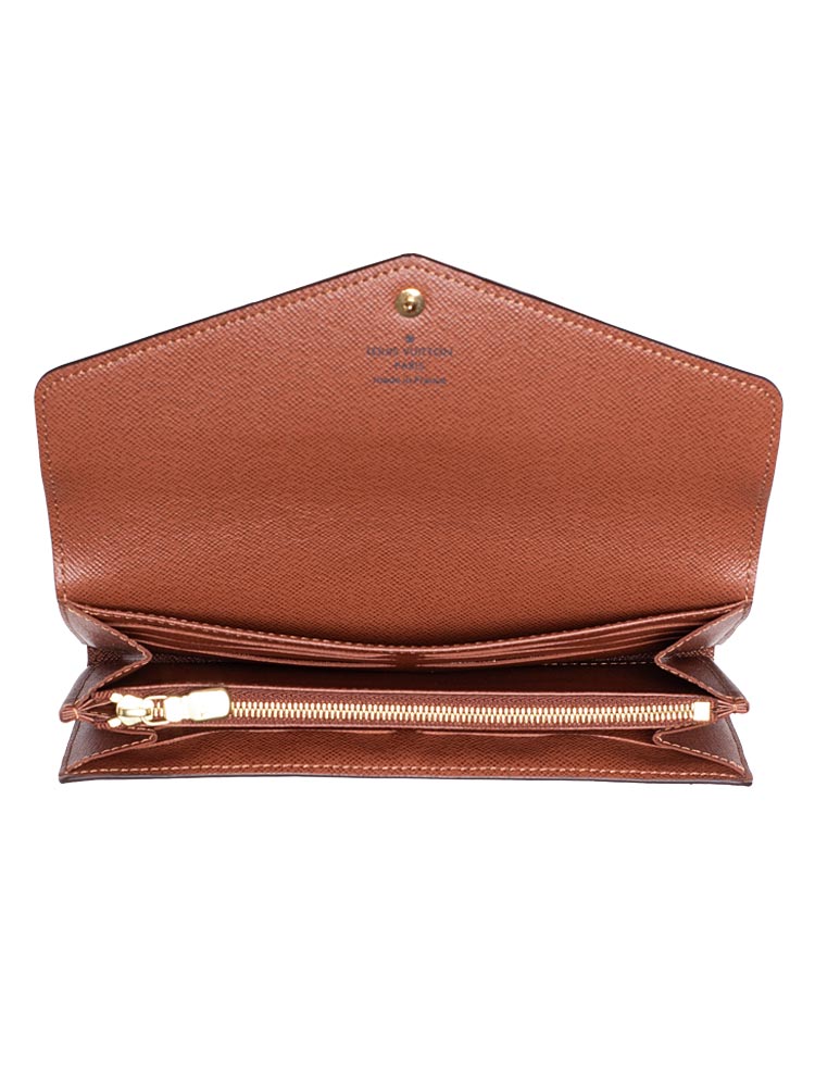 Crafted of traditional Louis Vuitton monogram toile canvas. The envelope-style crossover flap opens with a polished brass snap to a partitioned terra cotta cross-grain leather interior.