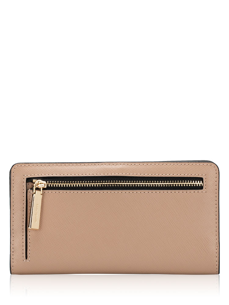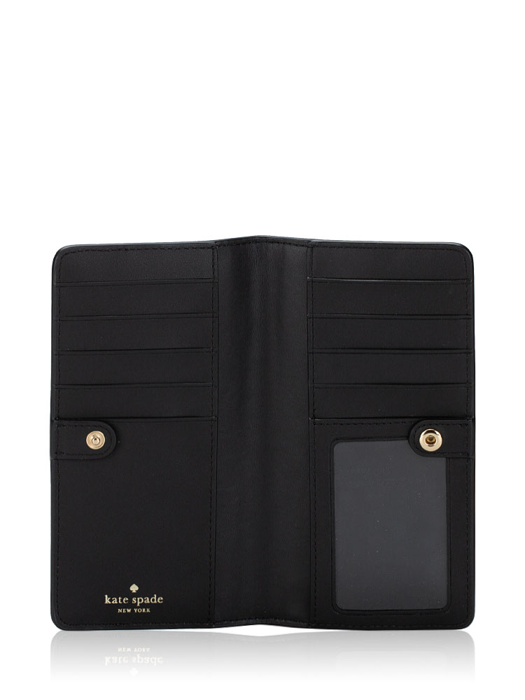 Made of saffiano leather. The wallet features a snap button closure that opens to smooth leather and polyester lining with interior two slip pockets, ten card slots, one id window slip pocket and exterior one zip pocket.