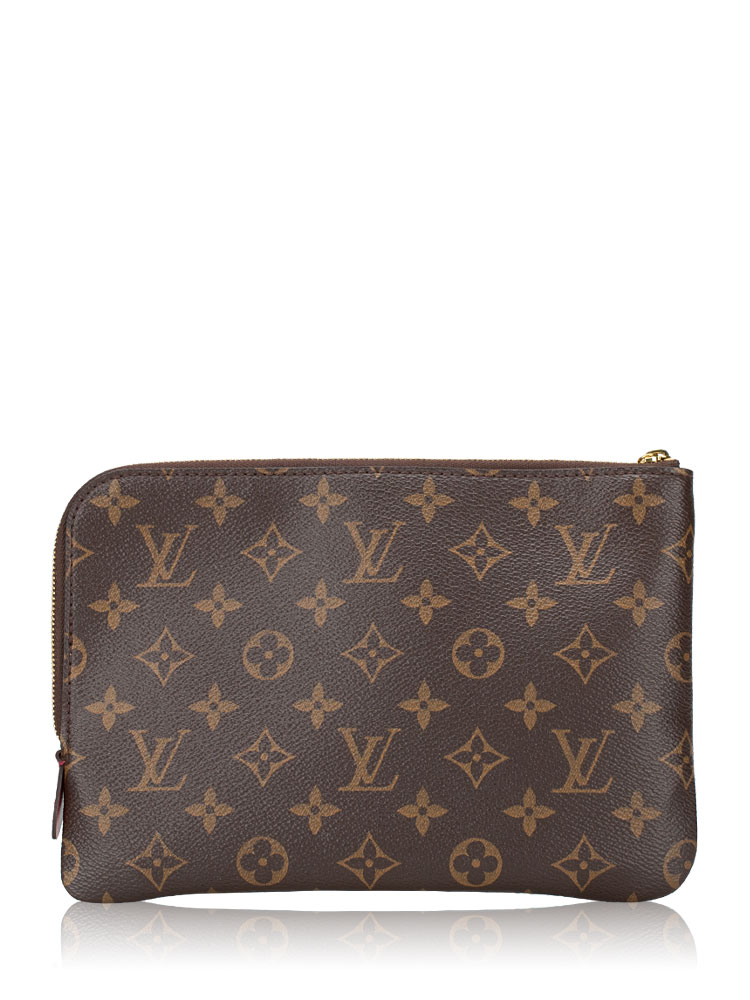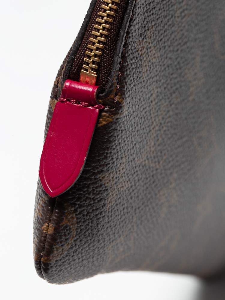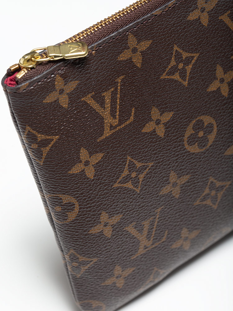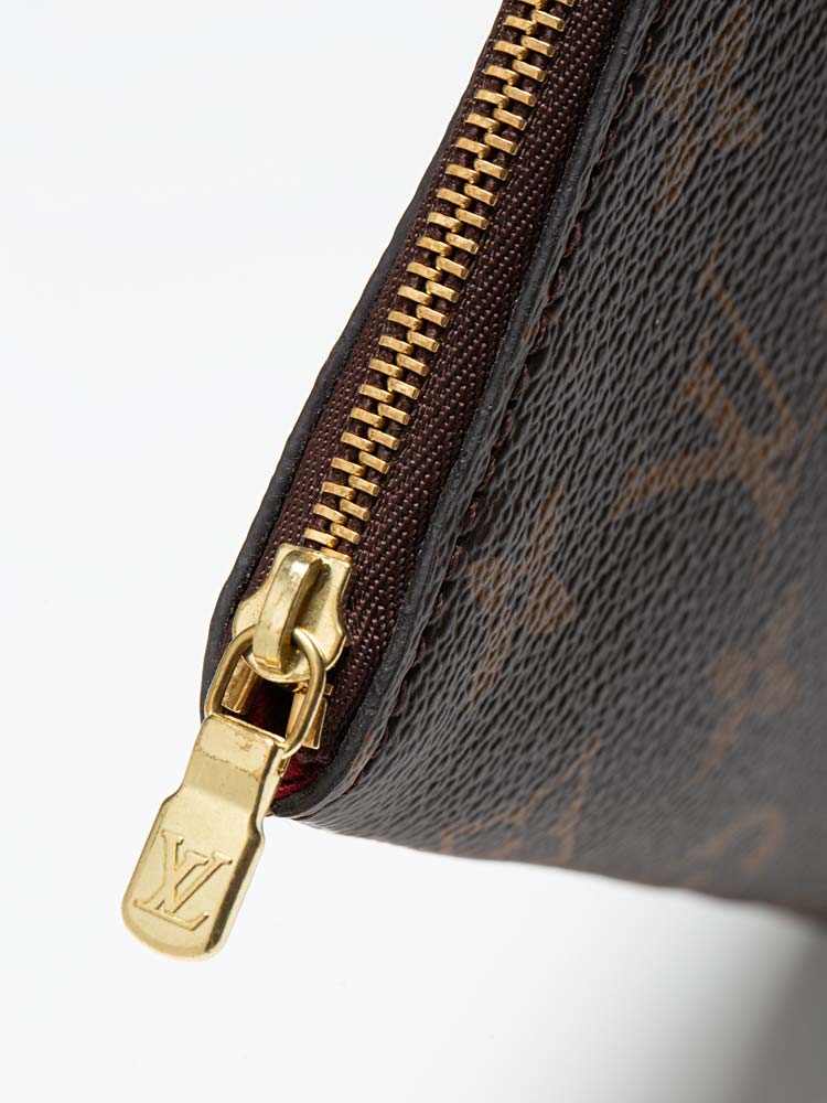 This pouch is crafted of LV Monogram coated canvas. It features 3/4 rounded zipper that opens to a fabric lining.