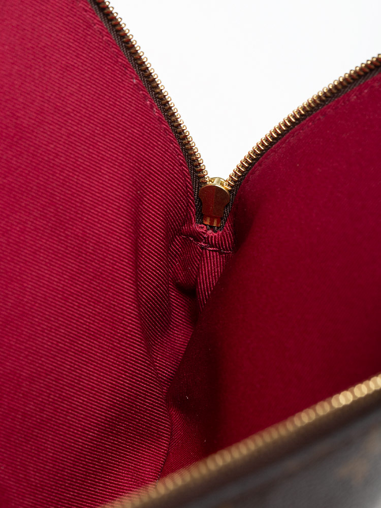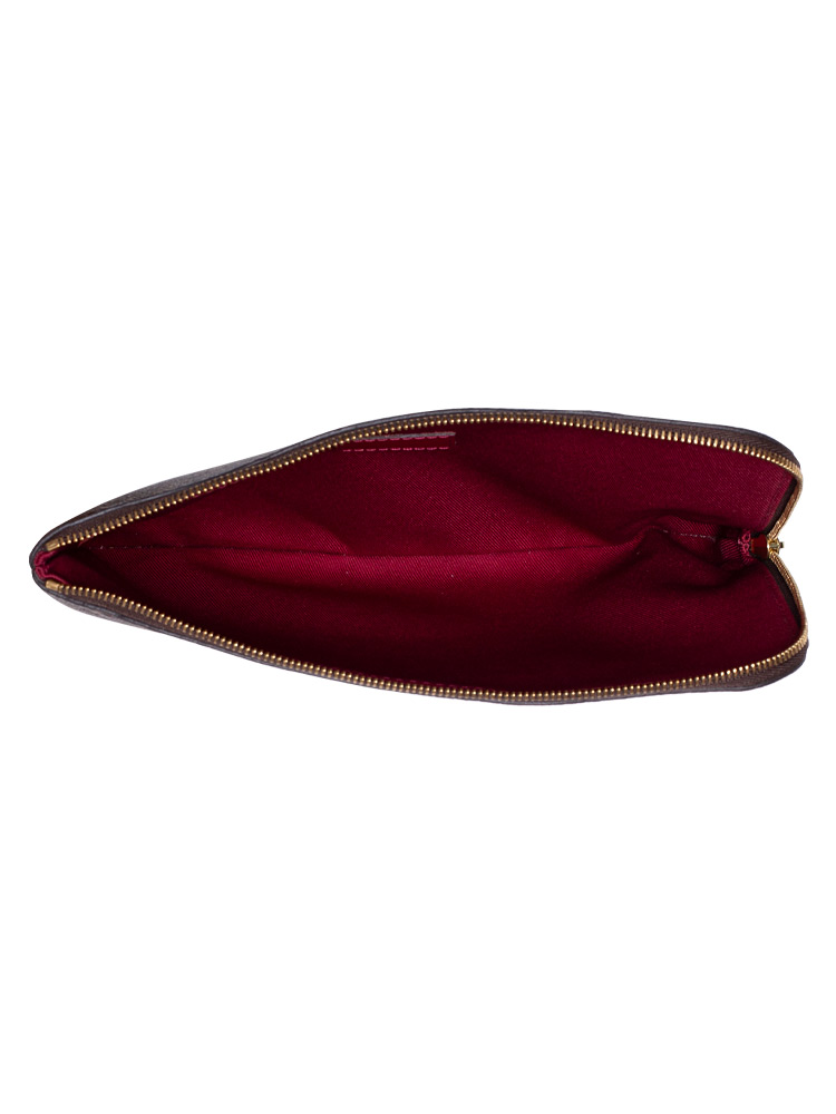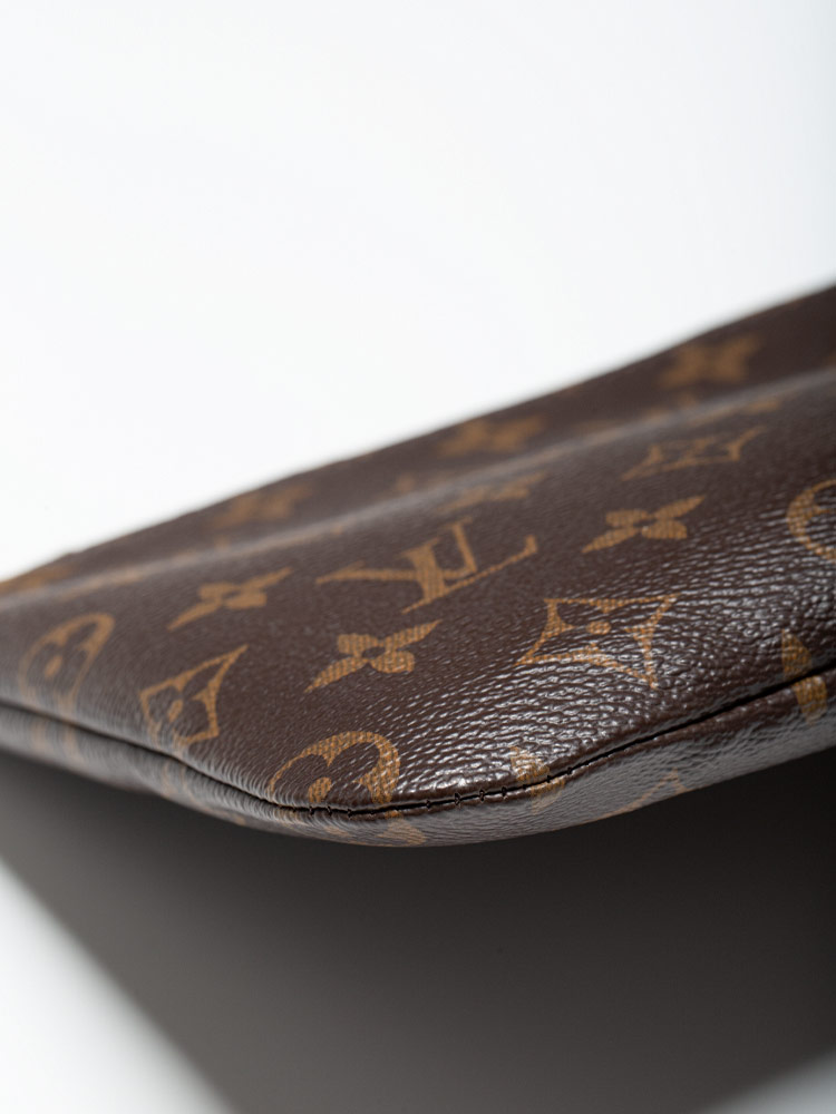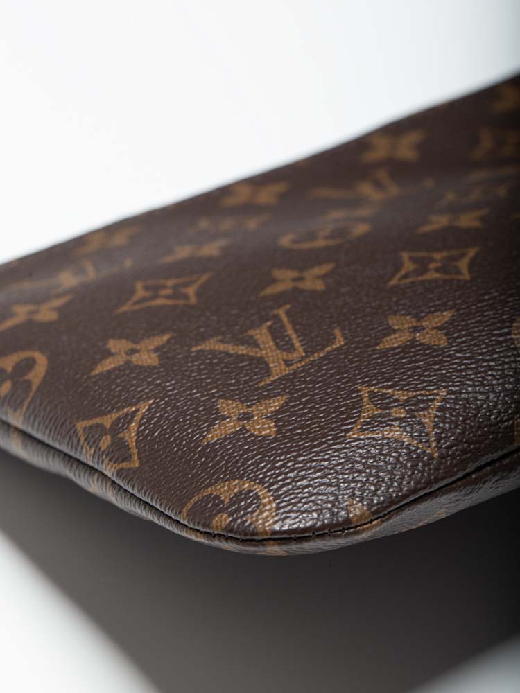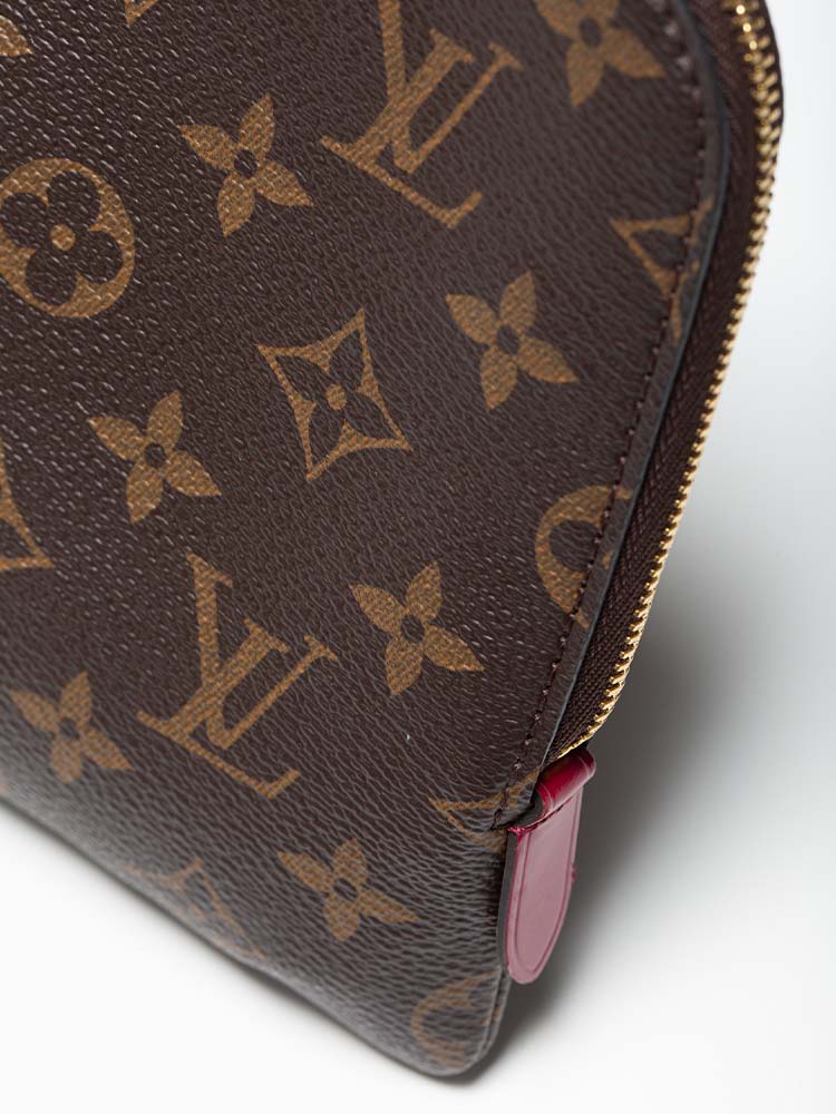 This pouch is crafted of LV Monogram coated canvas. It features 3/4 rounded zipper that opens to a fabric lining.