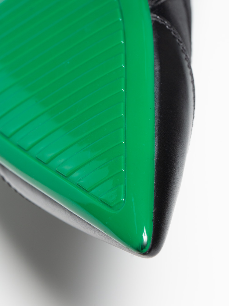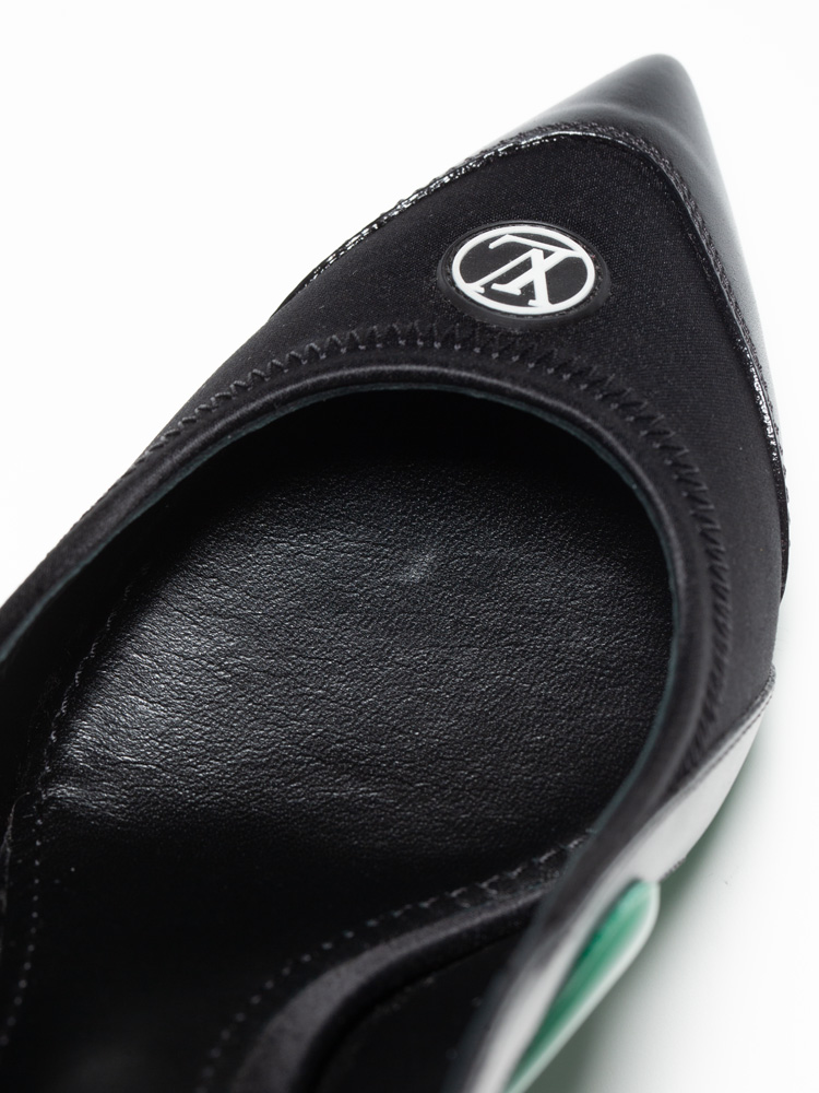 Crafted of calfskin leather and technical satin. They feature an adjustable velcro strap, leather lining, pointed toe, and 5 cm rubber heel.