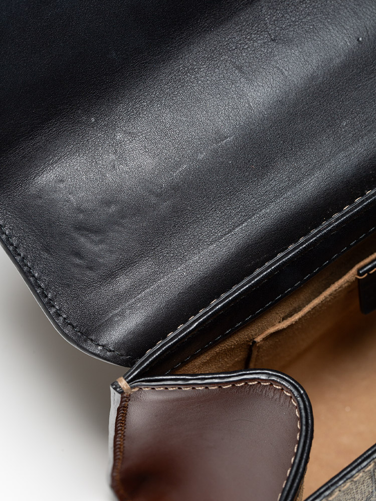 This shoulder bag is crafted of brown on beige Gucci GG supreme monogram coated canvas. The bag features a smooth black leather flap, a gold chain shoulder strap, and gold slide lock closure.