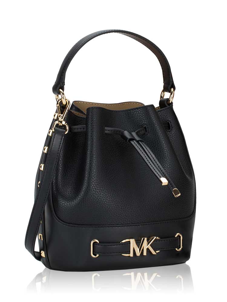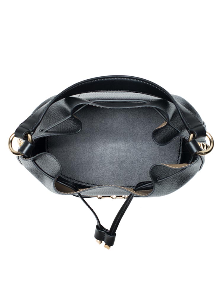 Made of pebbled leather. The bag features a open with drawstring closure that opens to leather lining with one card slot, top handle drop 10 cm, adjustable and removable long strap.