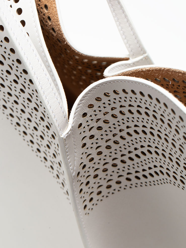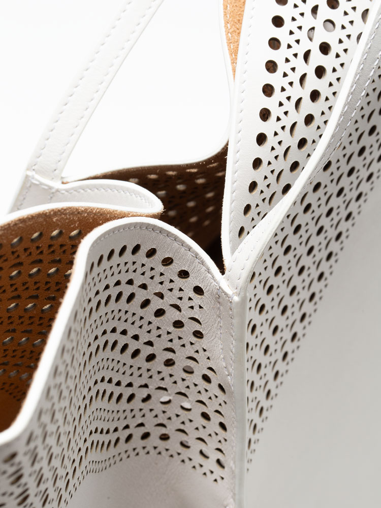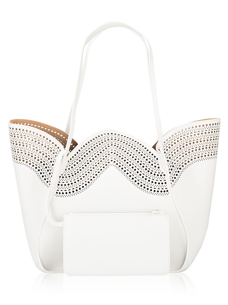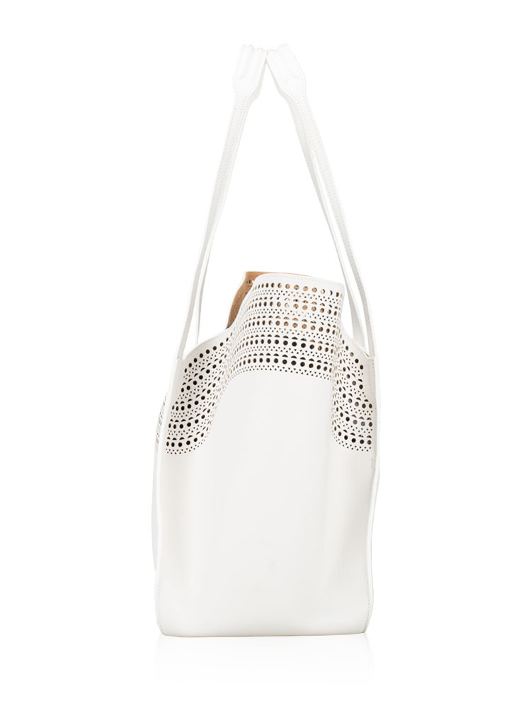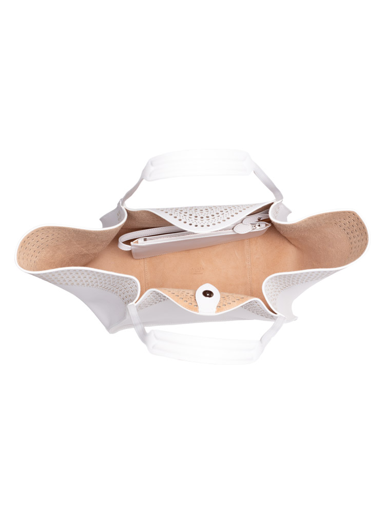 Crafted of calfskin leather with a perforated design throughout. The bag features leather strap handles and a broad open top that reveals a spacious suede leather interior with a removable leather pouch.