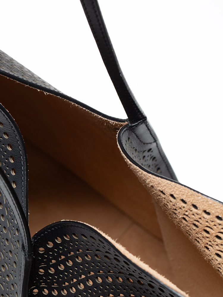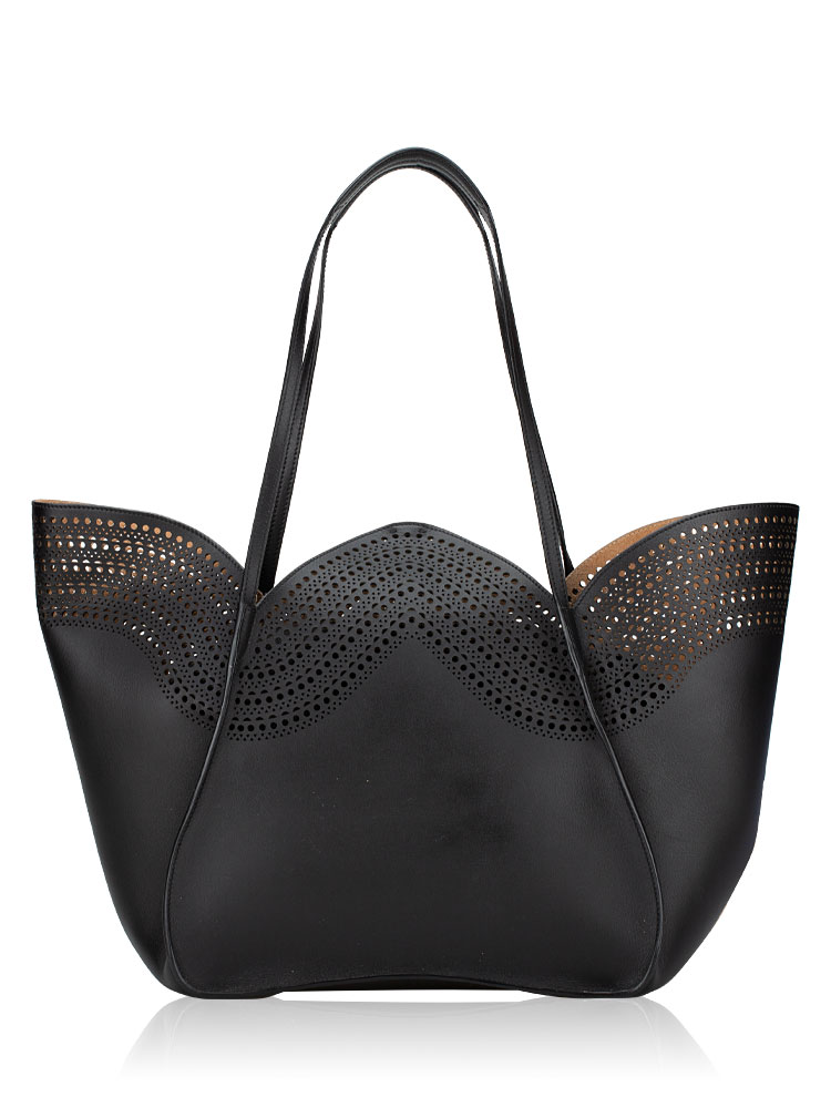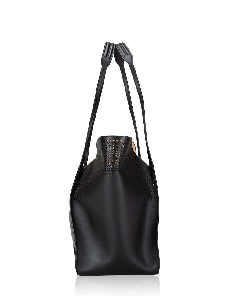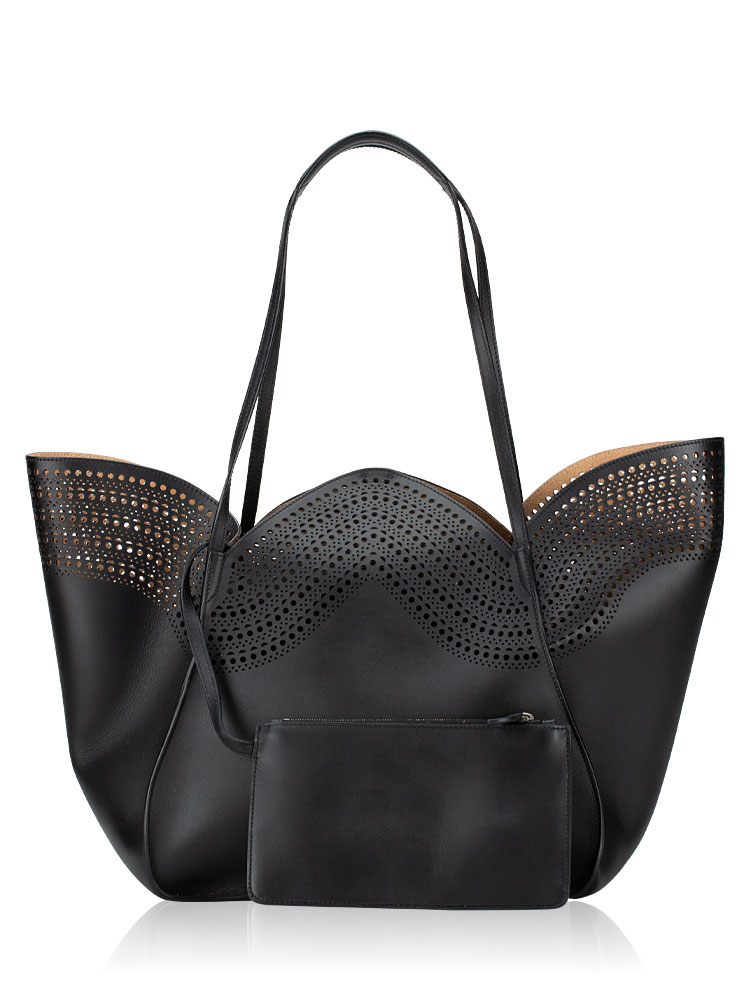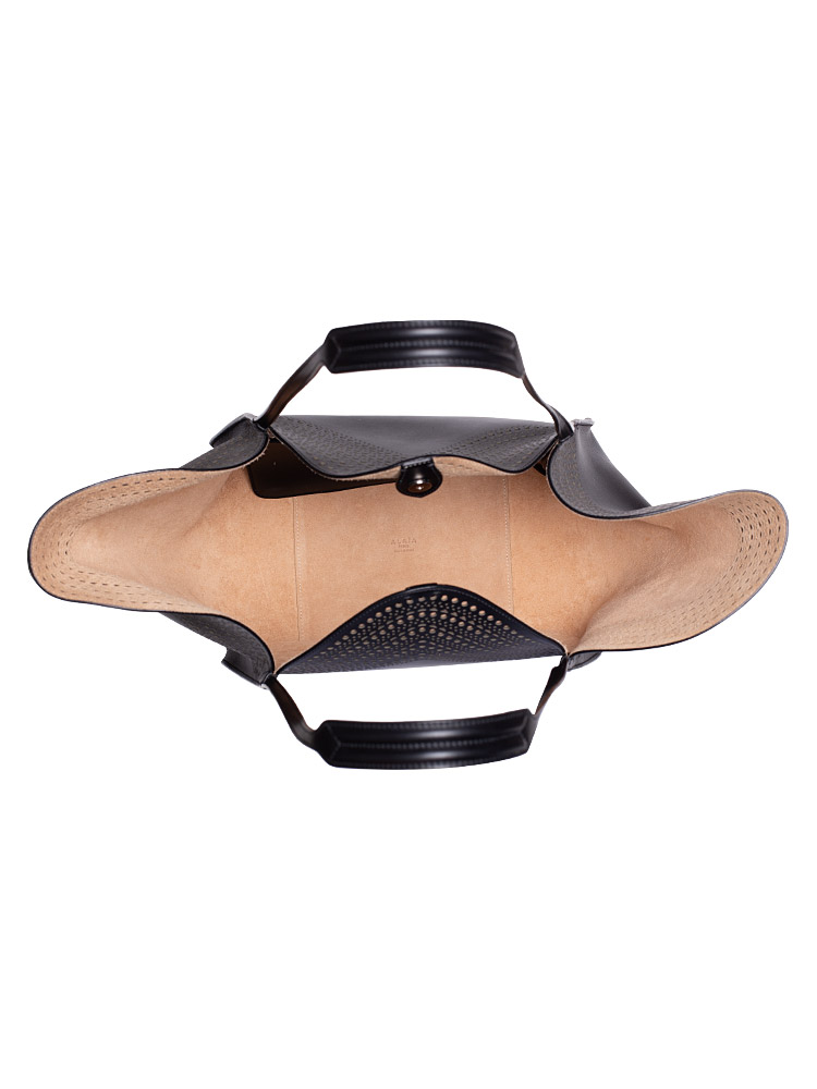 Crafted of calfskin leather with a laser-cut design throughout. The bag features leather strap handles and a broad open top that reveals a spacious suede interior with a removable leather pouch.