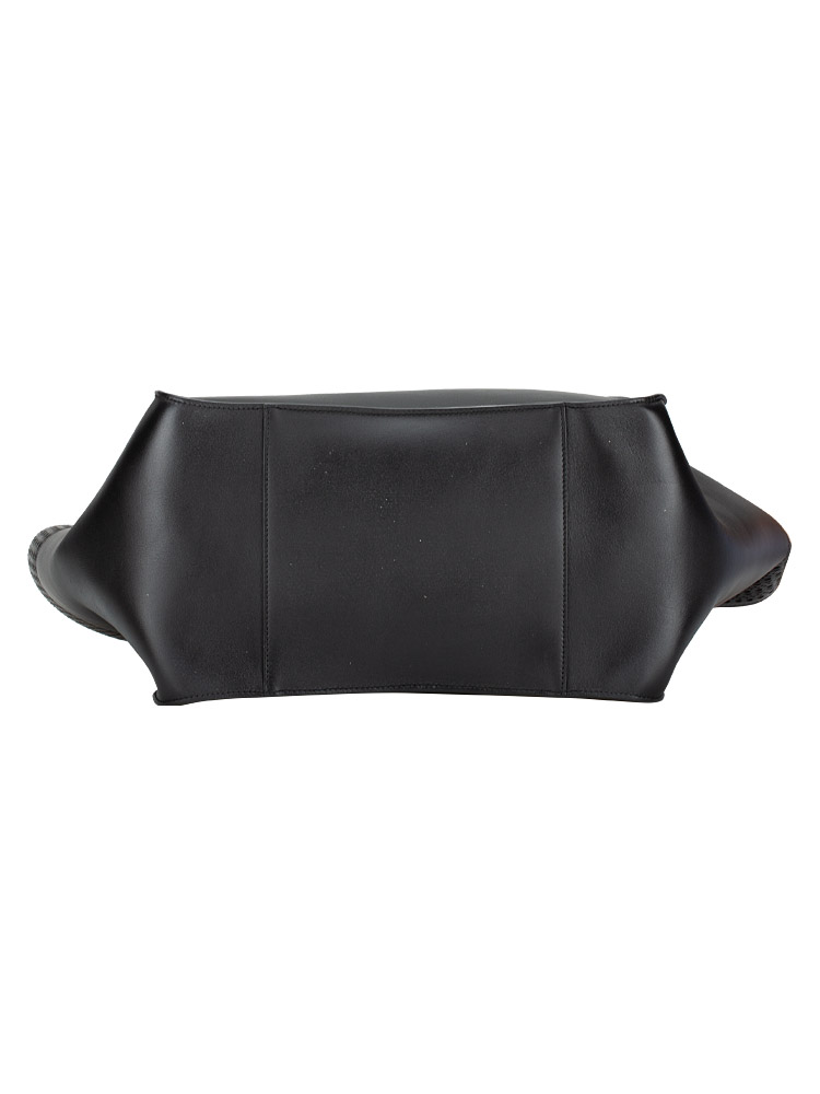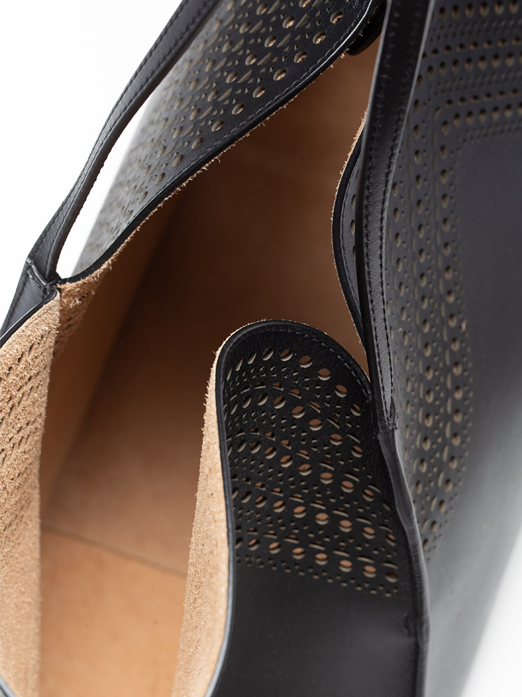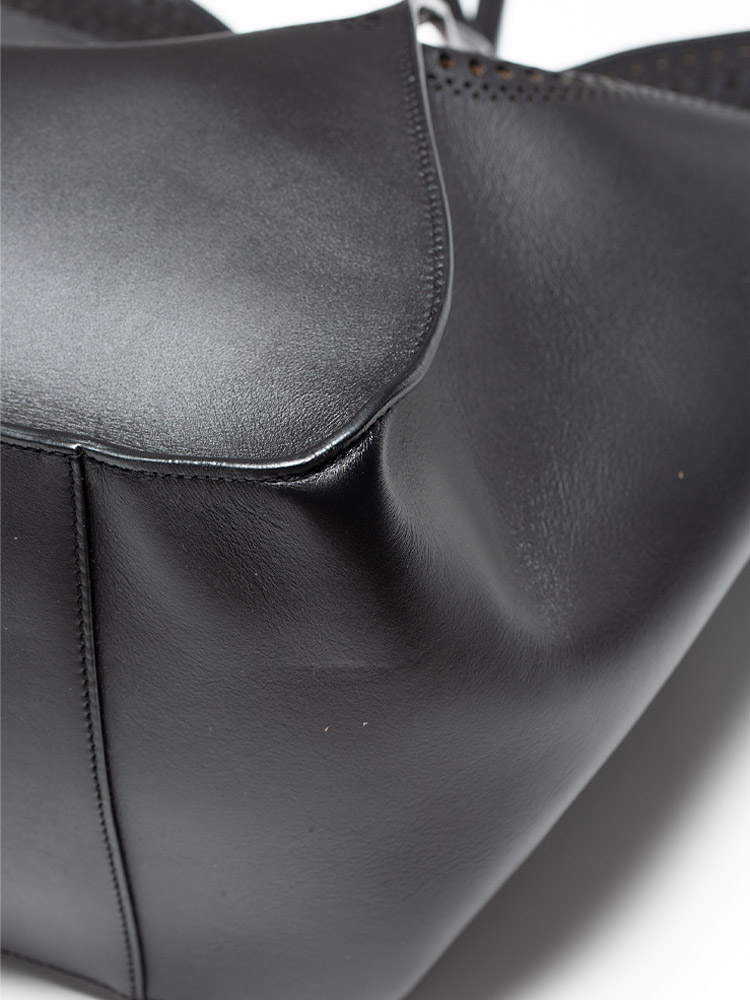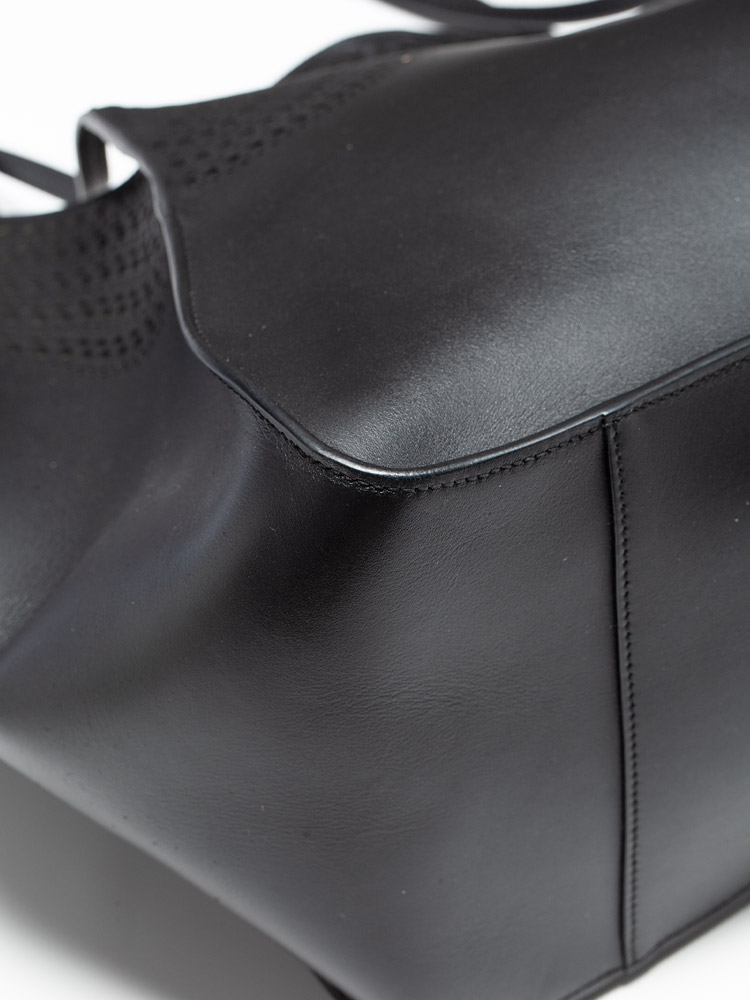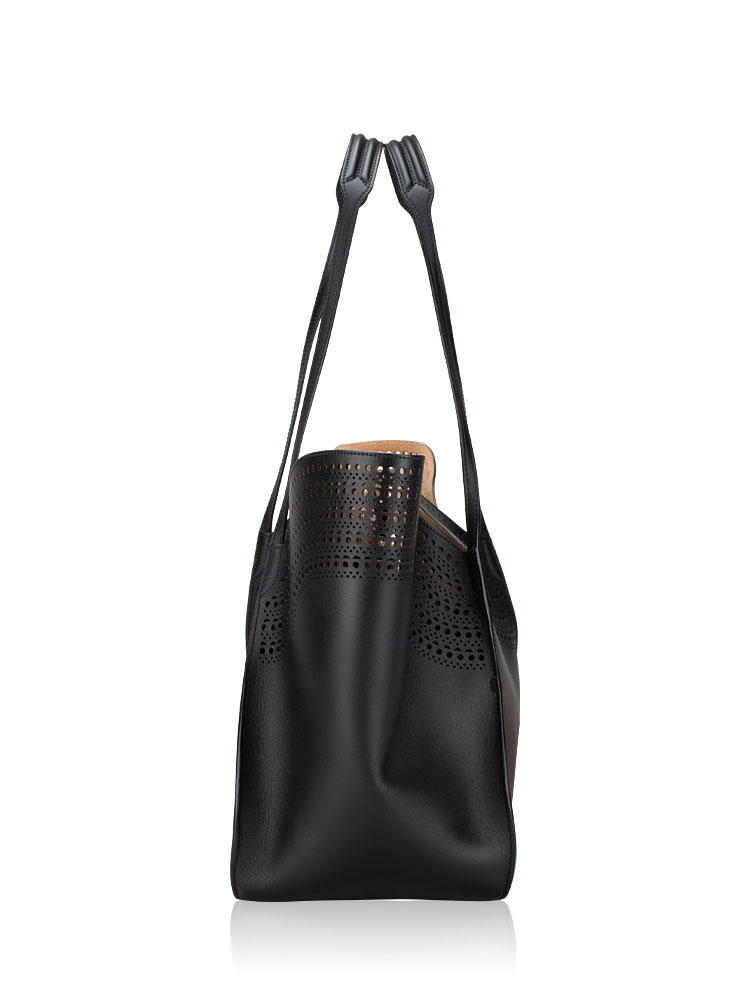 Crafted of calfskin leather with a laser-cut design throughout. The bag features leather strap handles and a broad open top that reveals a spacious suede interior with a removable leather pouch.