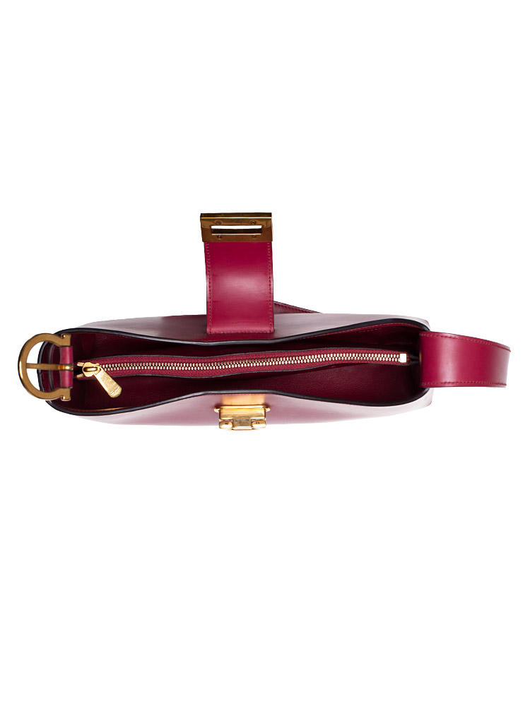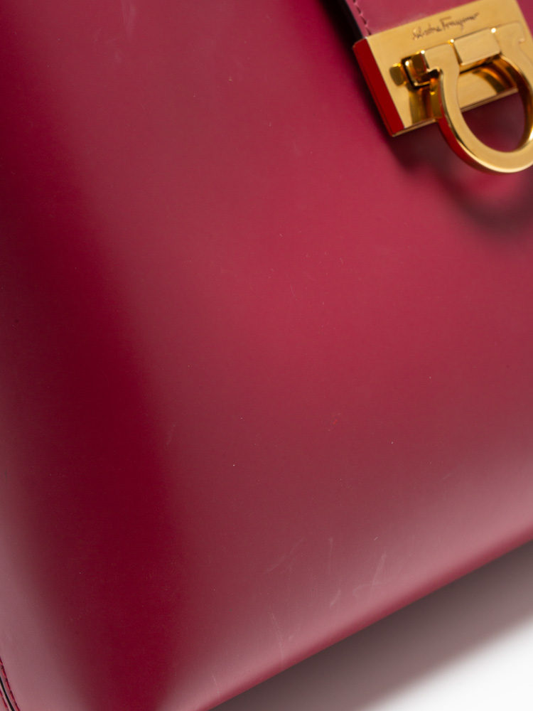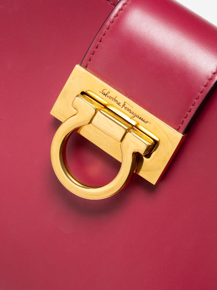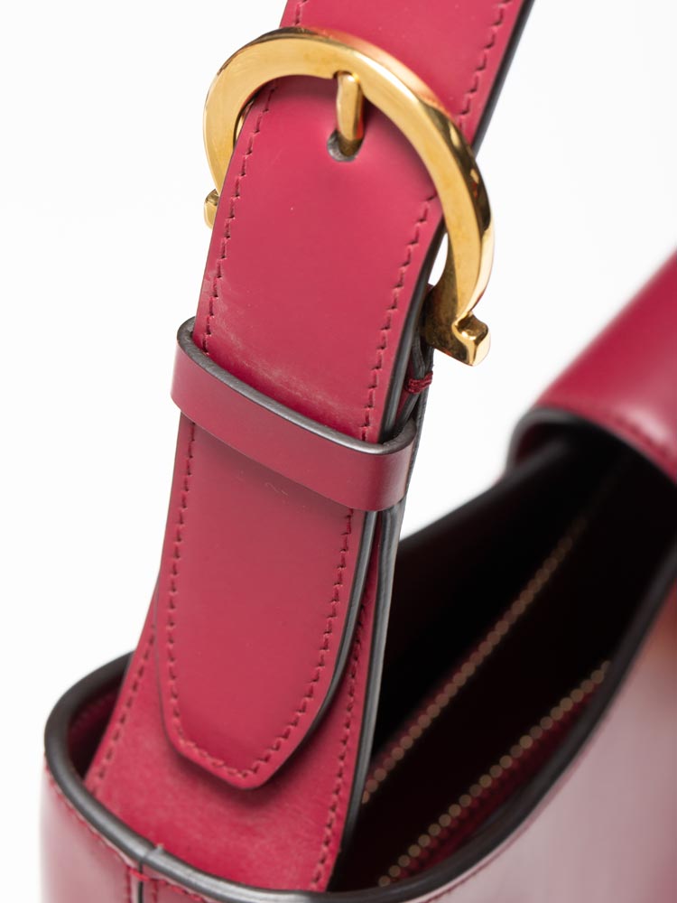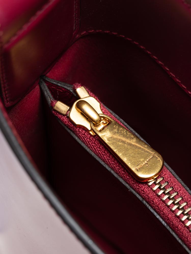 Crafted of smooth calfskin leather. It features an adjustable leather strap handle and gold hardware. The Gancini lock is open to a leather lining with slip pocket and zipper compartment.