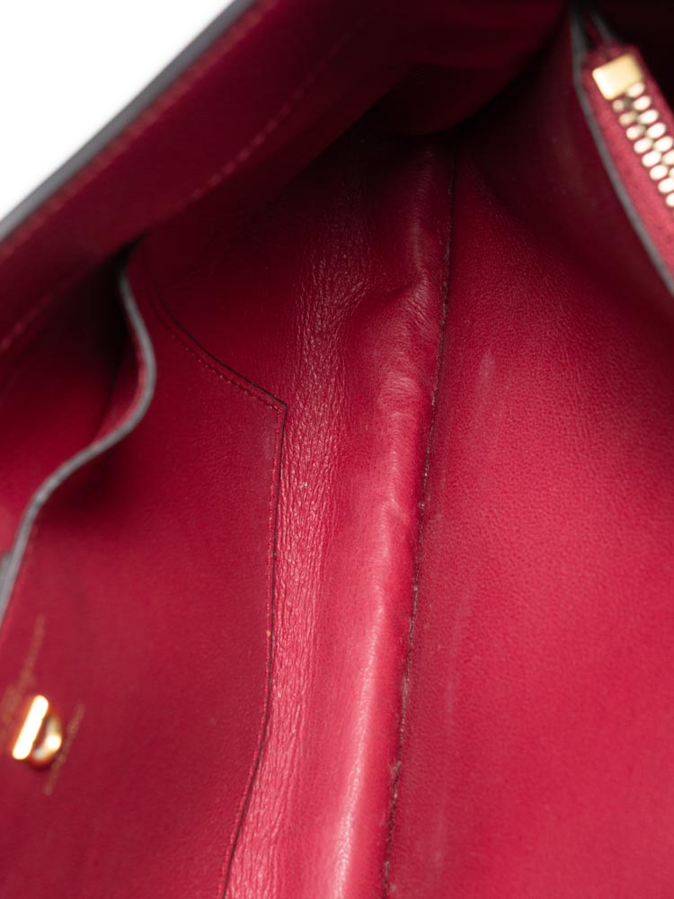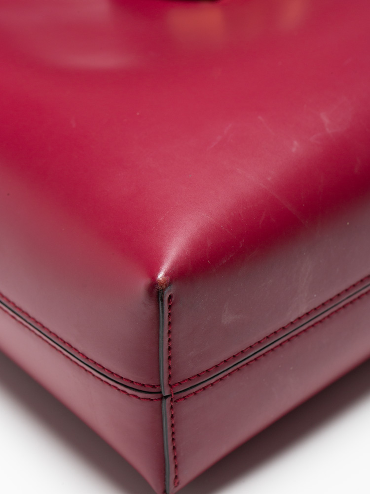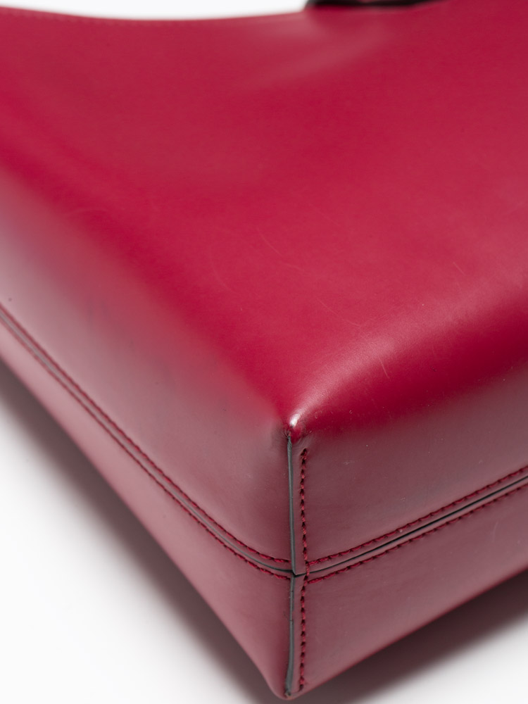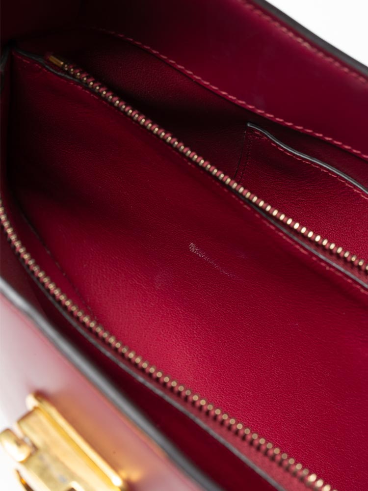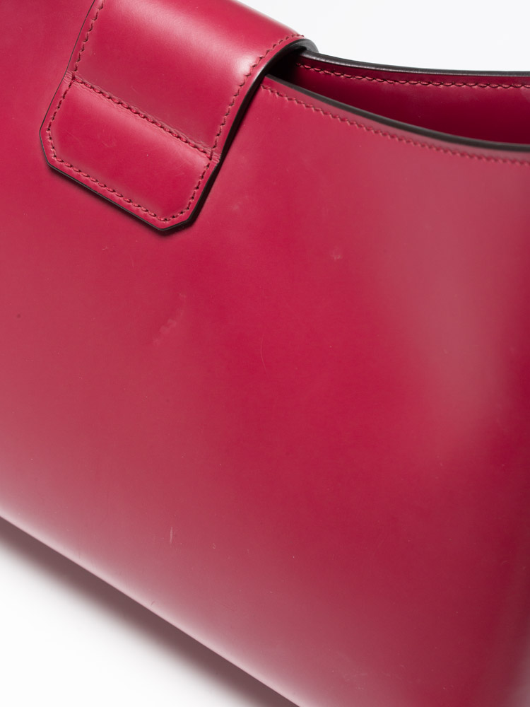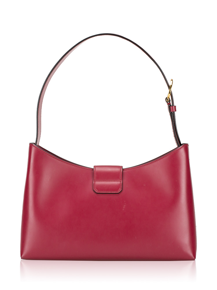 Crafted of smooth calfskin leather. It features an adjustable leather strap handle and gold hardware. The Gancini lock is open to a leather lining with slip pocket and zipper compartment.