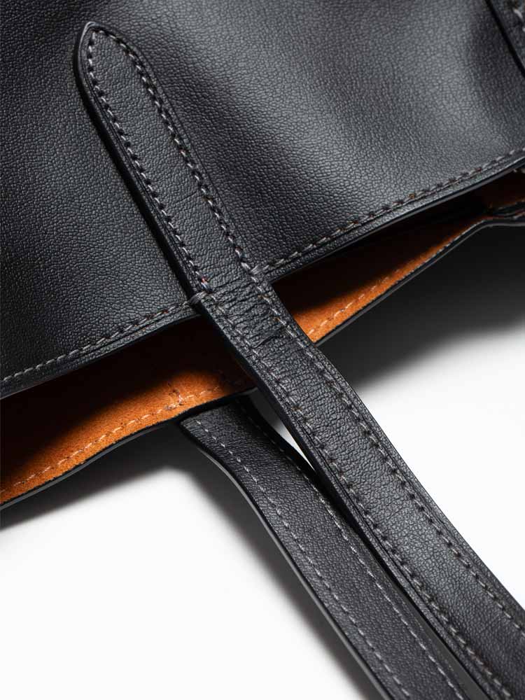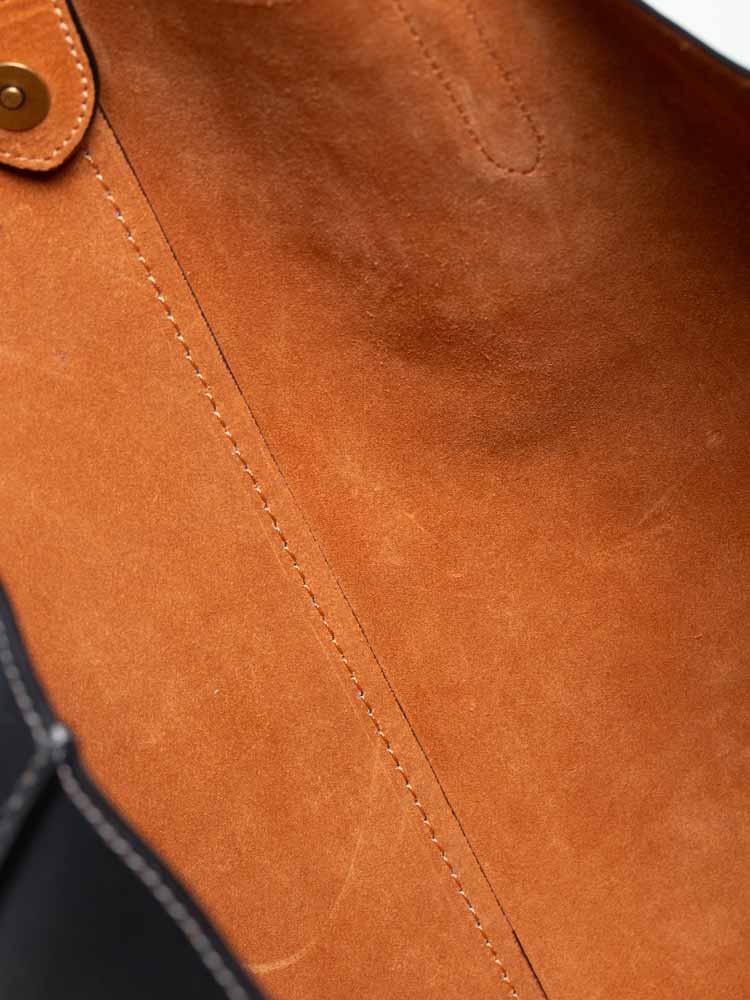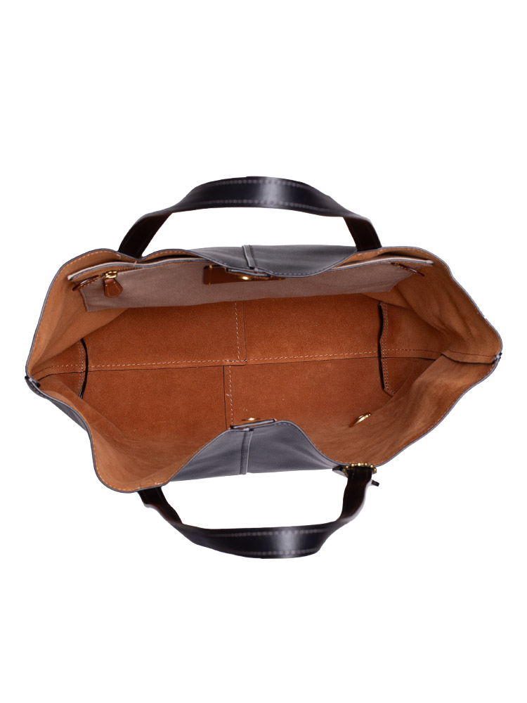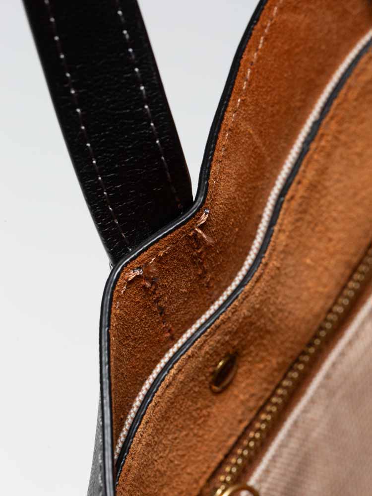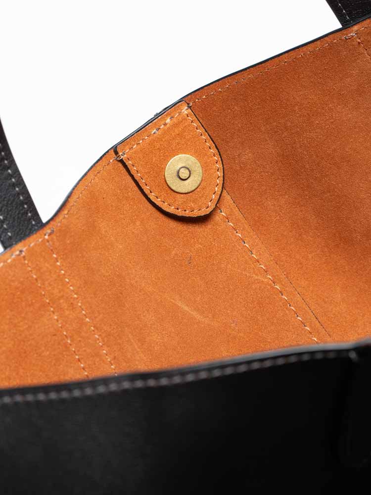 Made of smooth leather. The bag features a magnetic closure that opens to suede lining with interior one zip pocket.