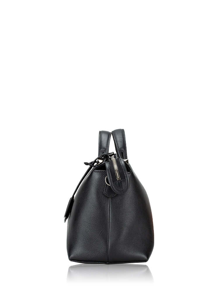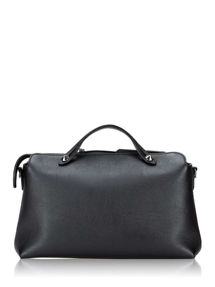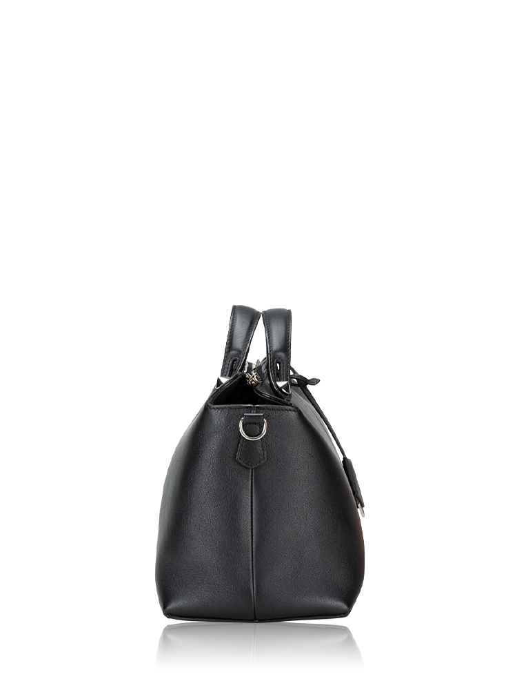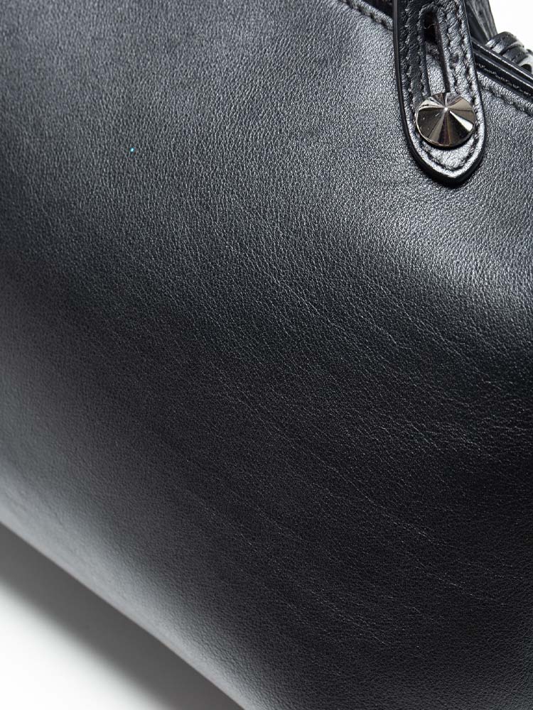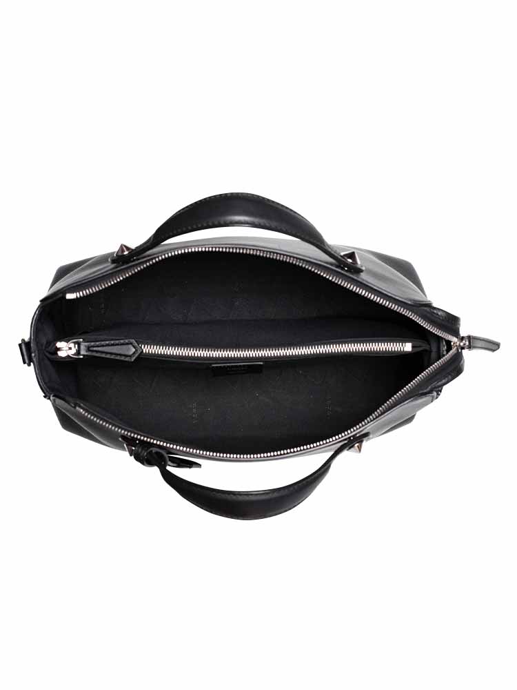 Crafted of calfskin leather. Features leather top handles with polished silver pointed cone studs and a leather shoulder strap. The top zipper opens to a fabric lining with a zipper compartment and slip pockets.