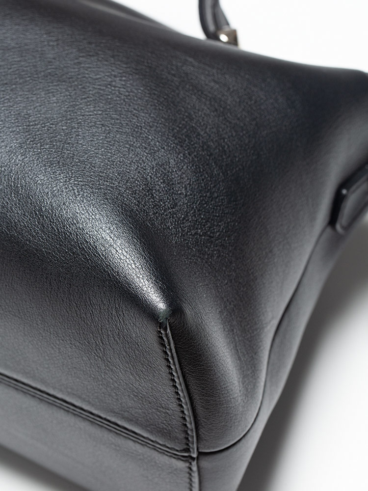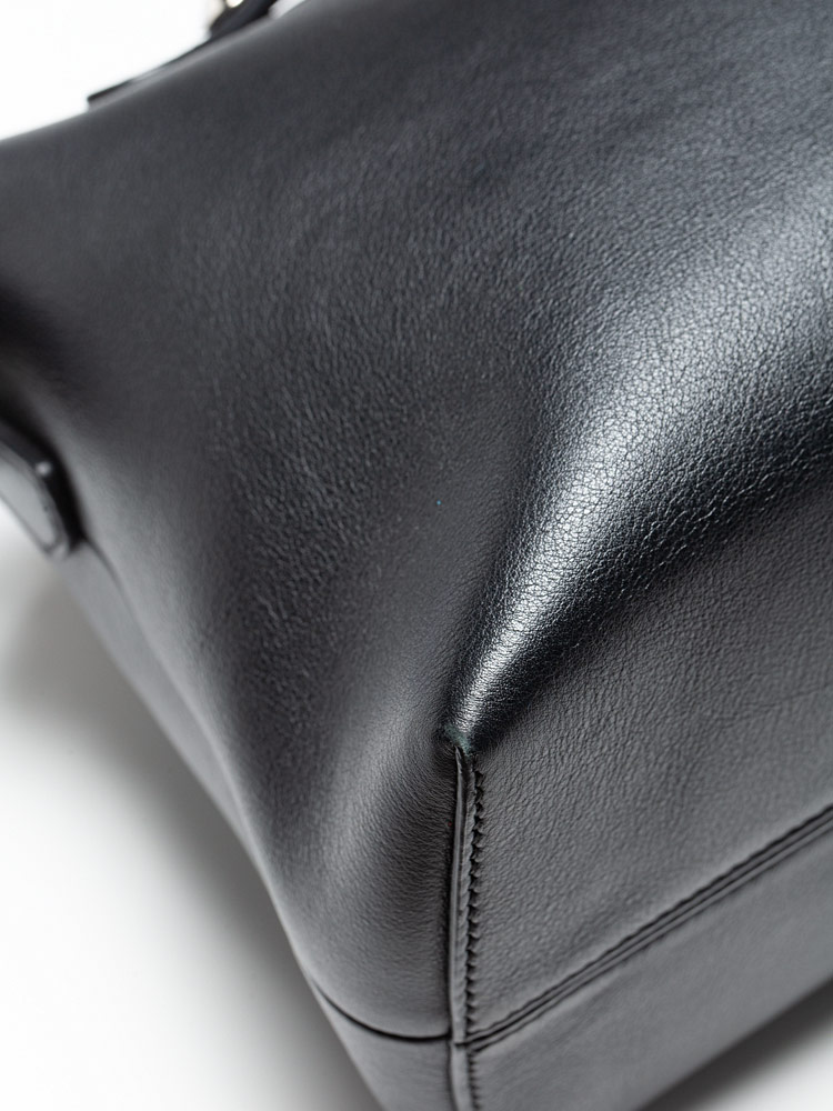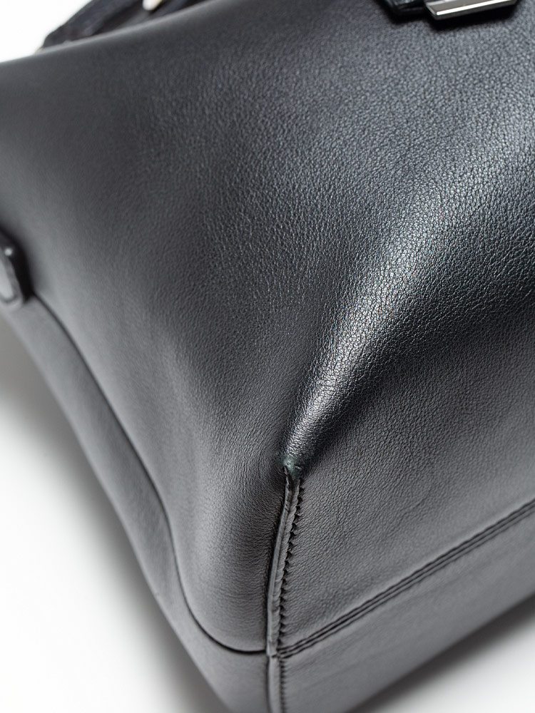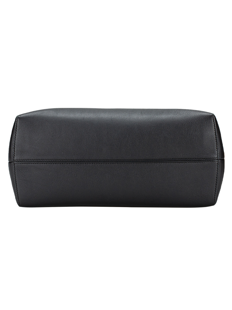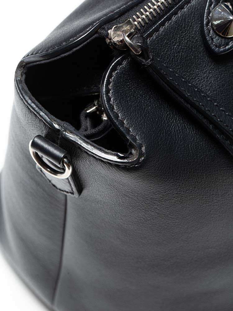 Crafted of calfskin leather. Features leather top handles with polished silver pointed cone studs and a leather shoulder strap. The top zipper opens to a fabric lining with a zipper compartment and slip pockets.