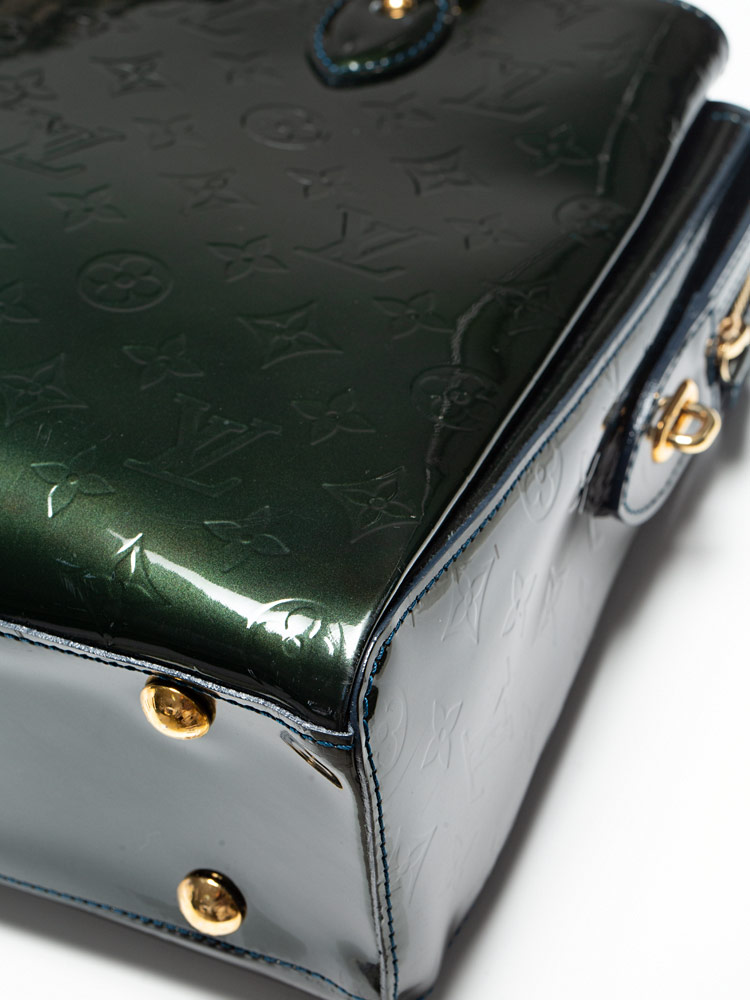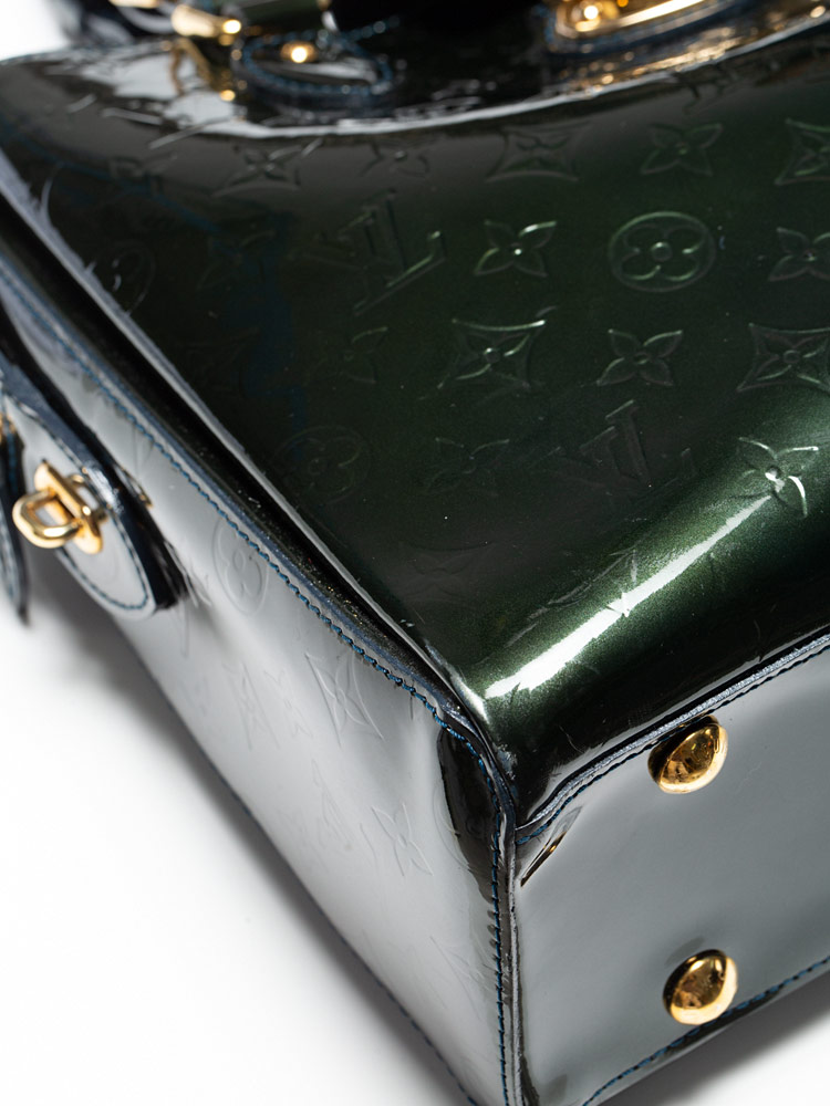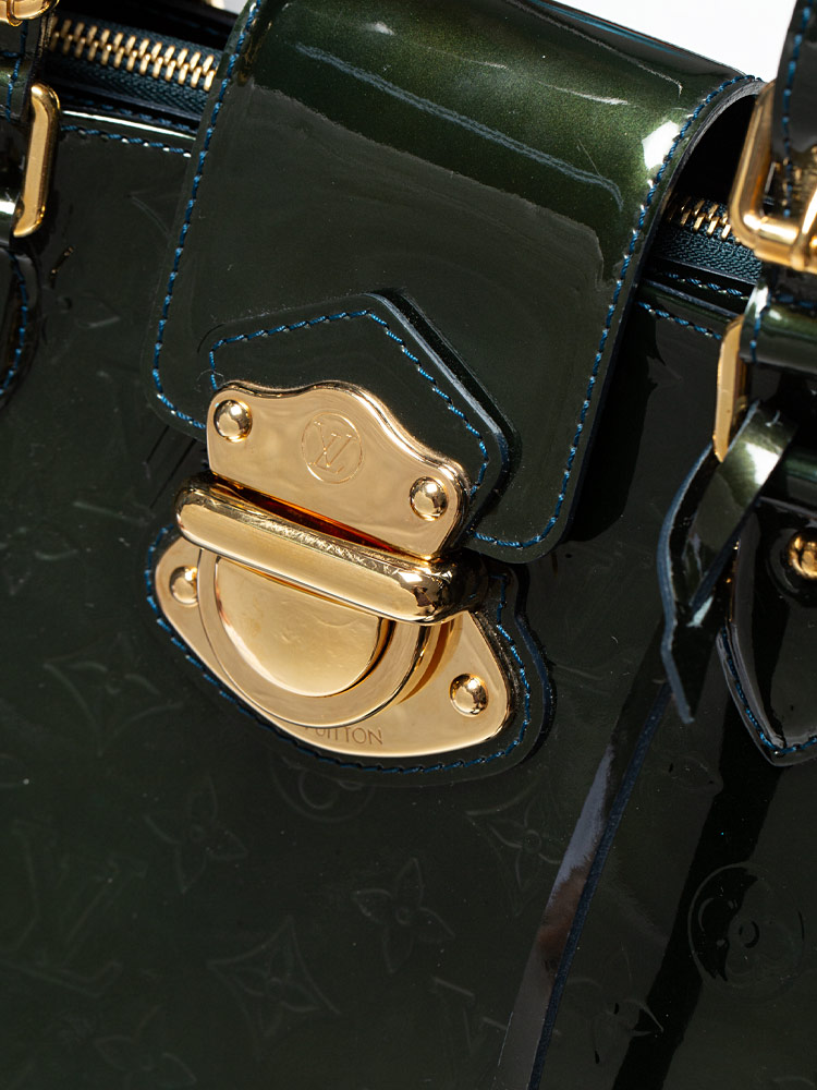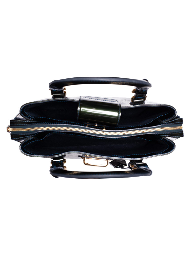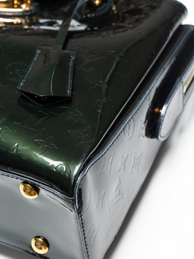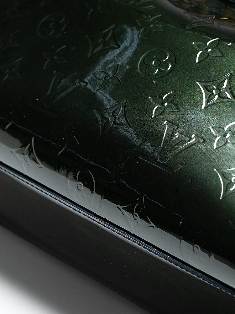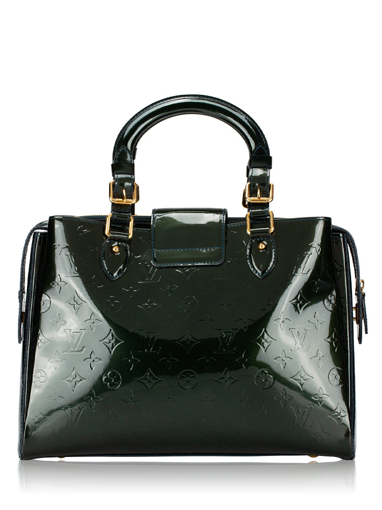 Crafted of Louis Vuitton monogram embossed vernis patent leather. Features patent leather top handles and a cross over strap with a polished brass press lock. The bag open to a fabric interior with patch pockets and two additional pocket compartments
