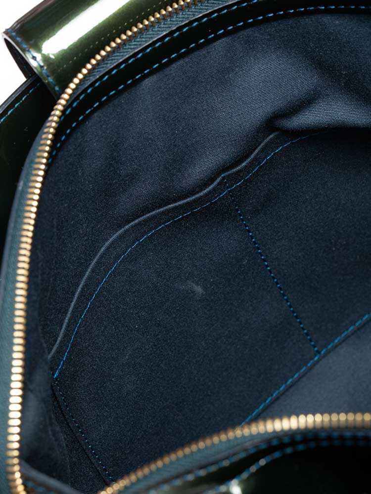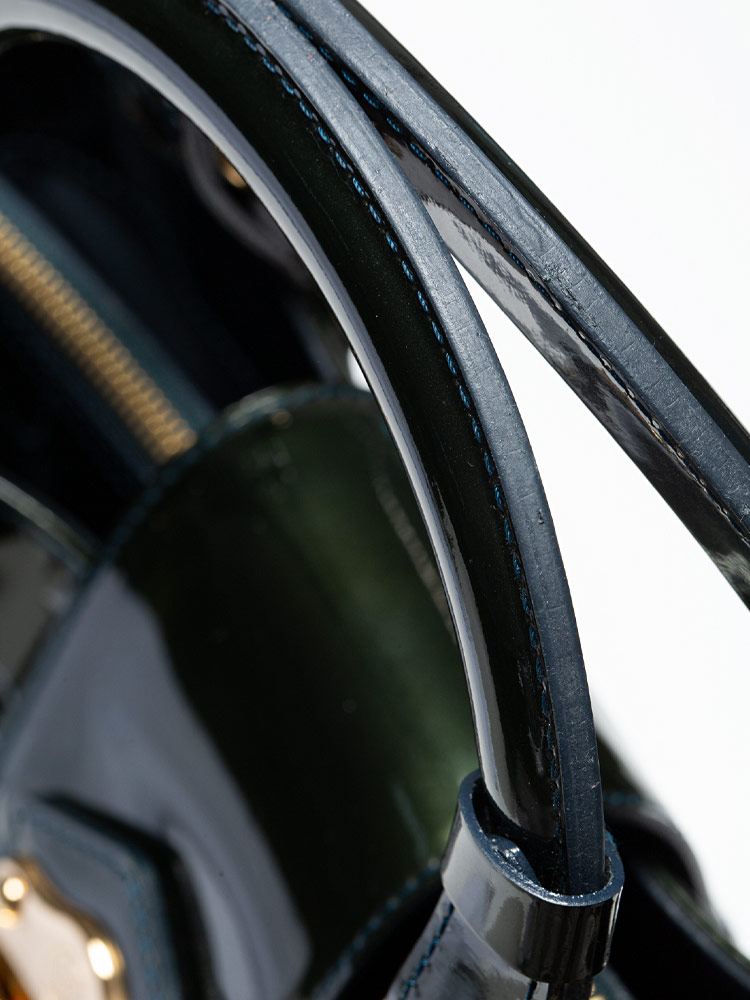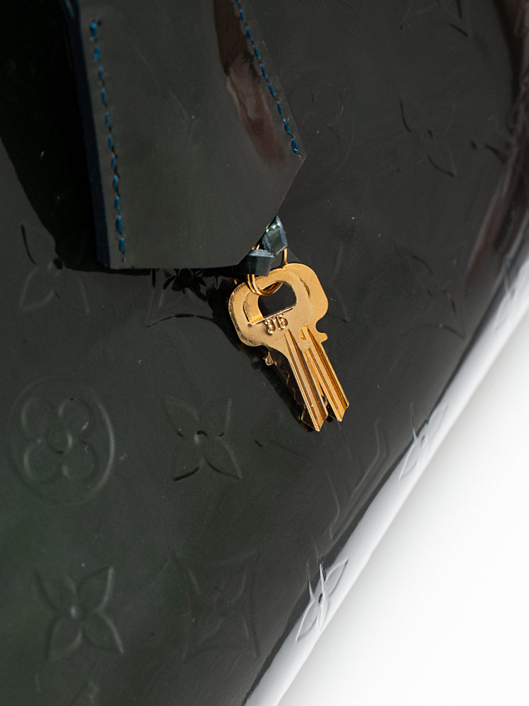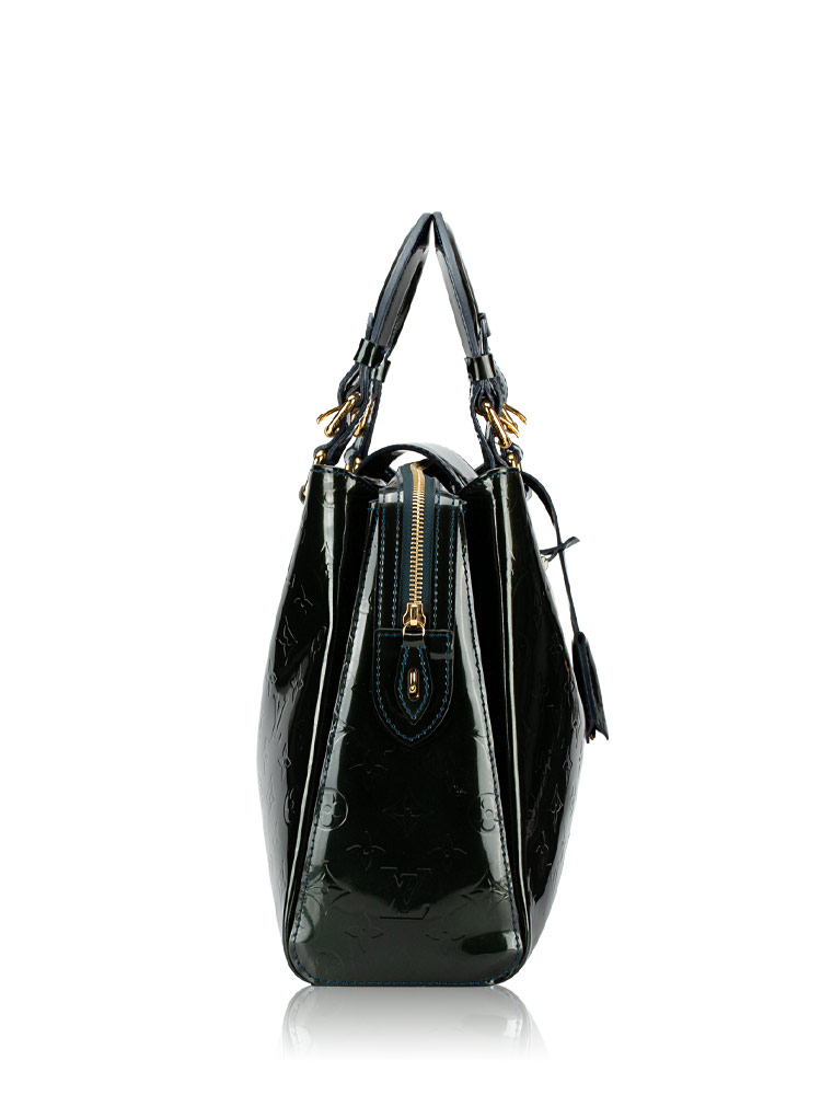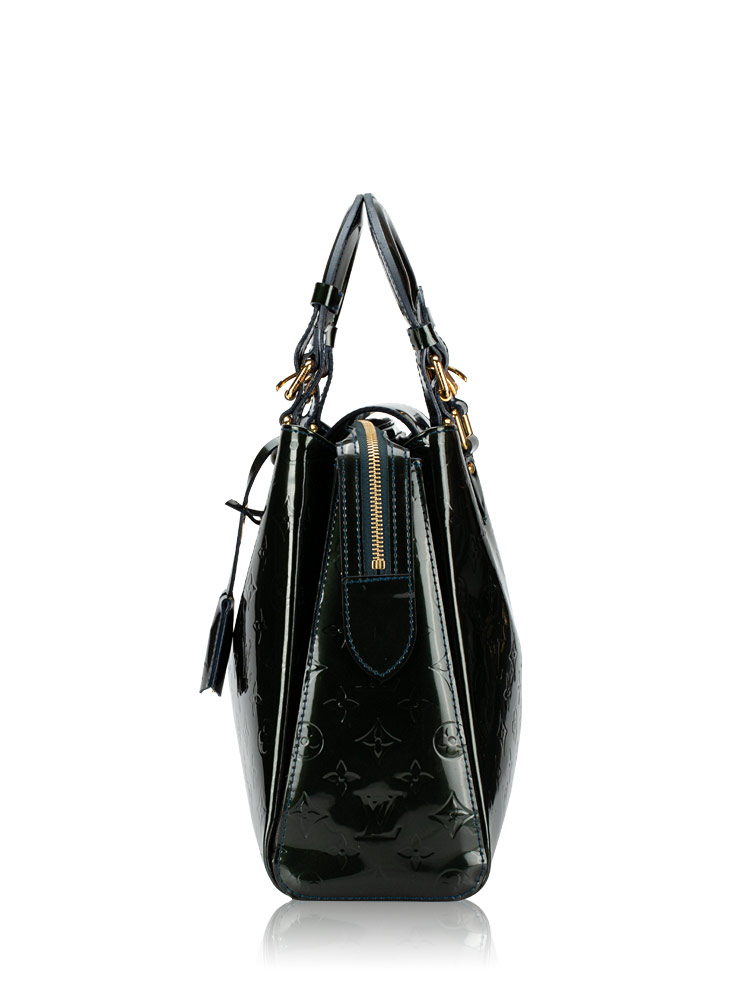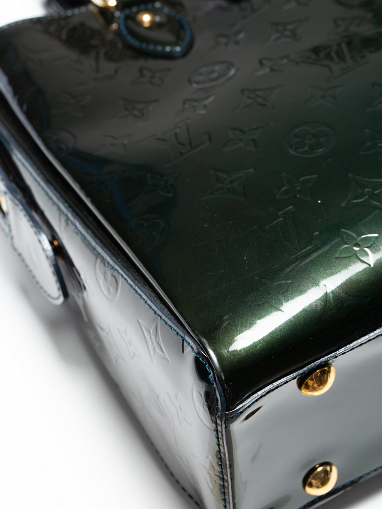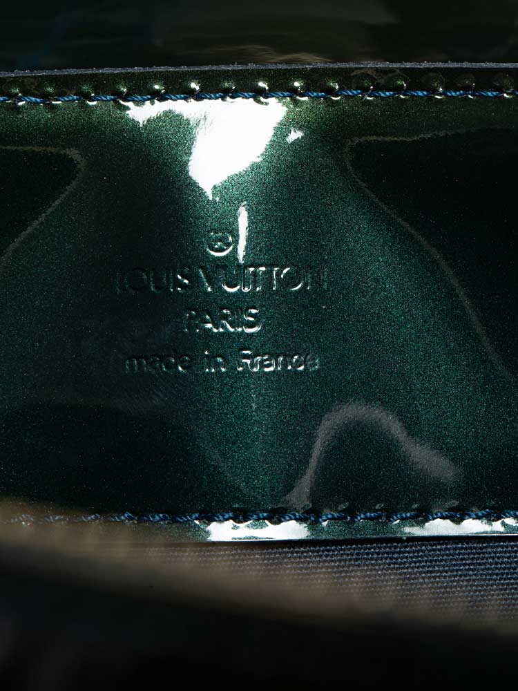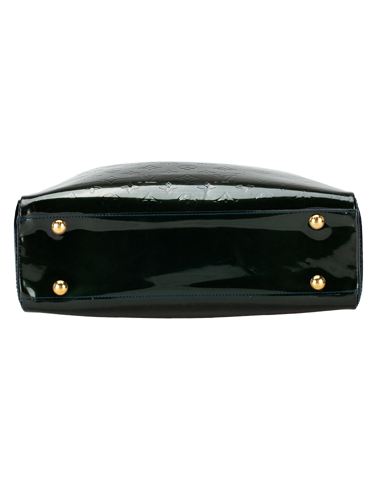 Crafted of Louis Vuitton monogram embossed vernis patent leather. Features patent leather top handles and a cross over strap with a polished brass press lock. The bag open to a fabric interior with patch pockets and two additional pocket compartments