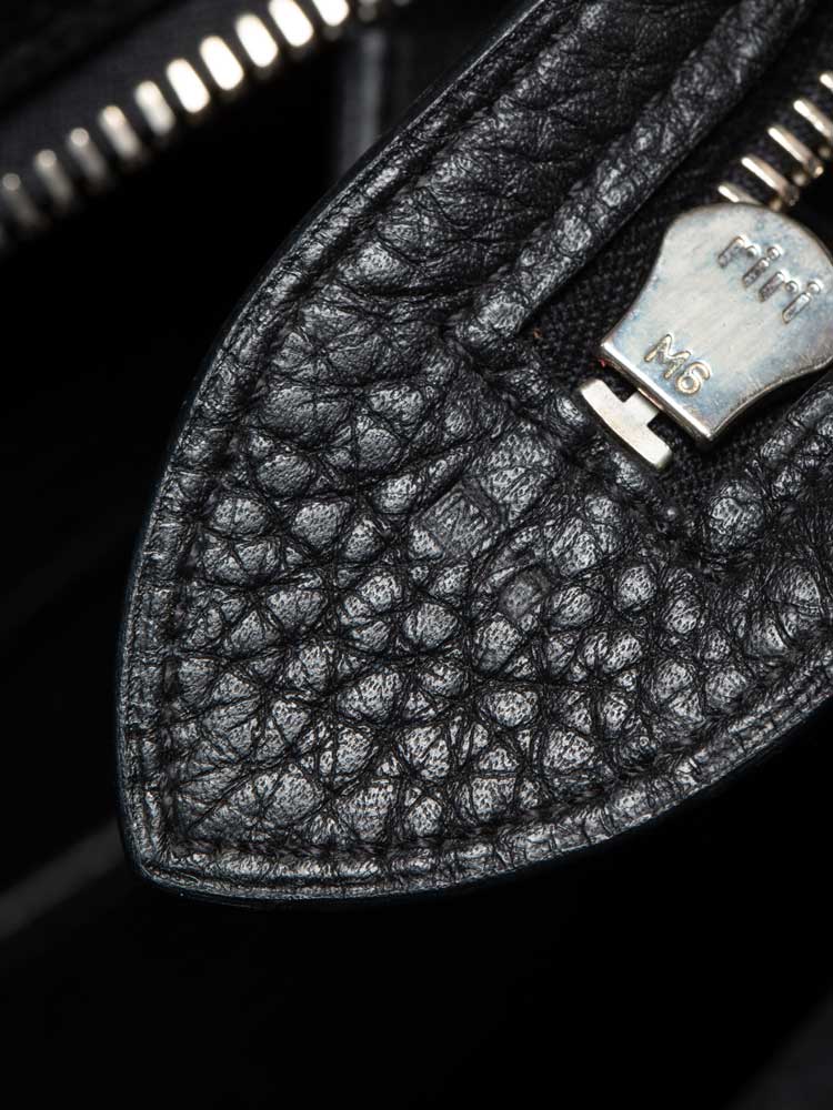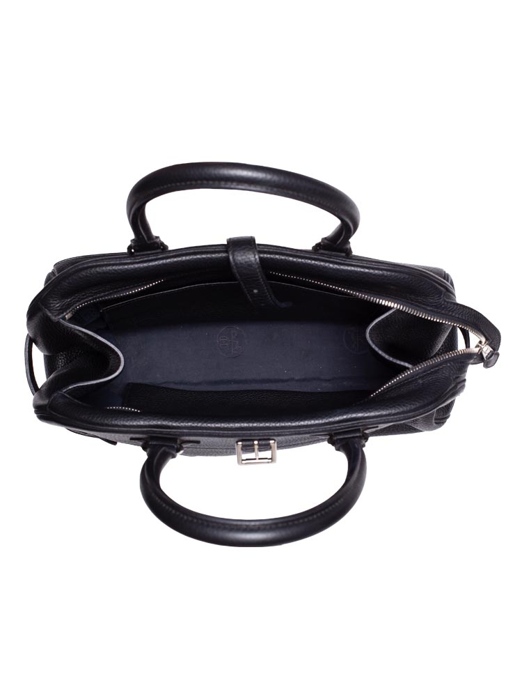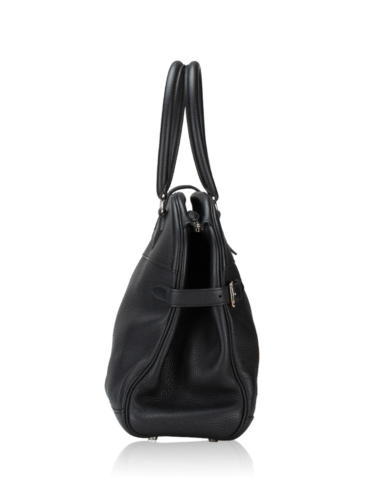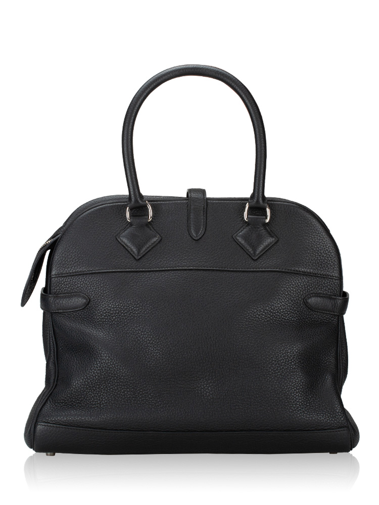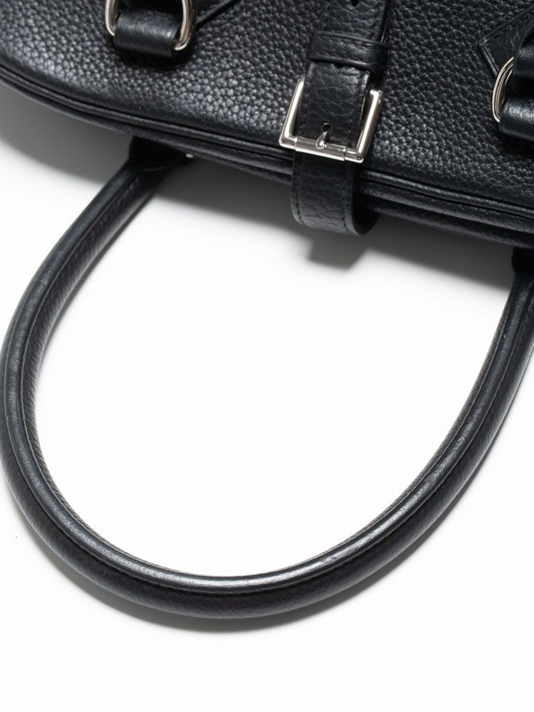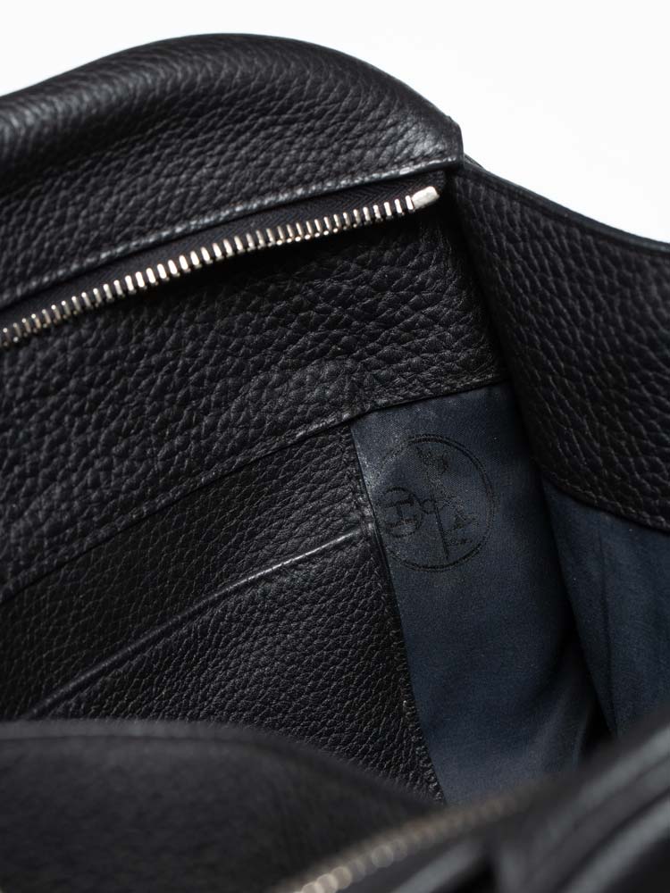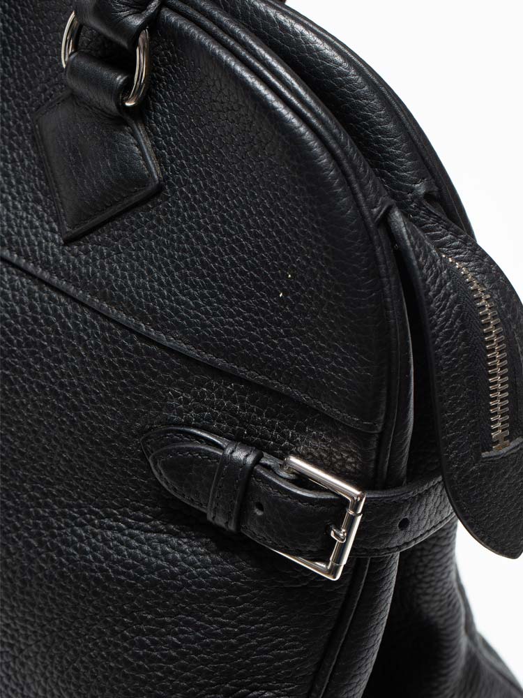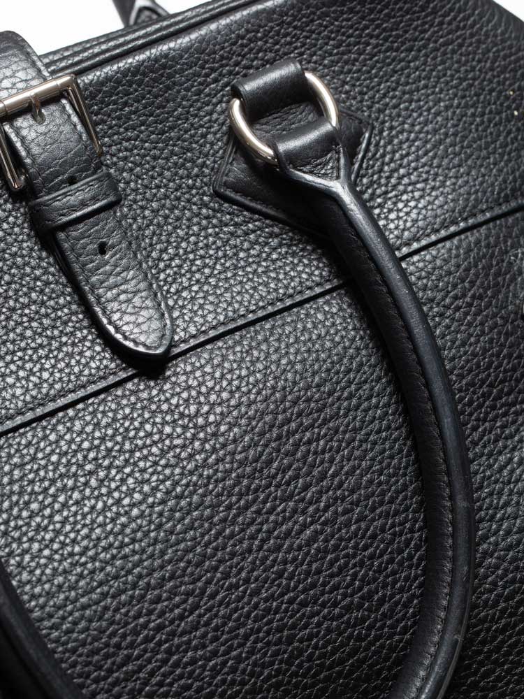 Created out of fine clemence leather. The bag features rolled leather top handles, belts and polished palladium hardware. The top zipper opens to a leather and jacquard interior with patch pockets.